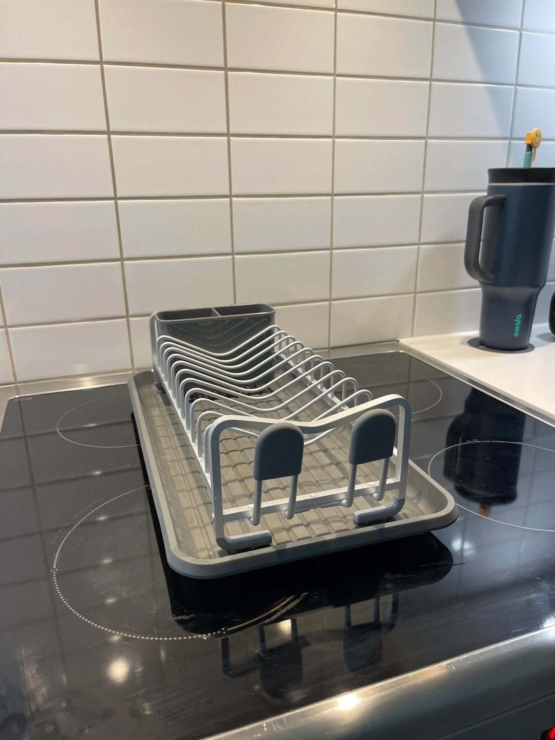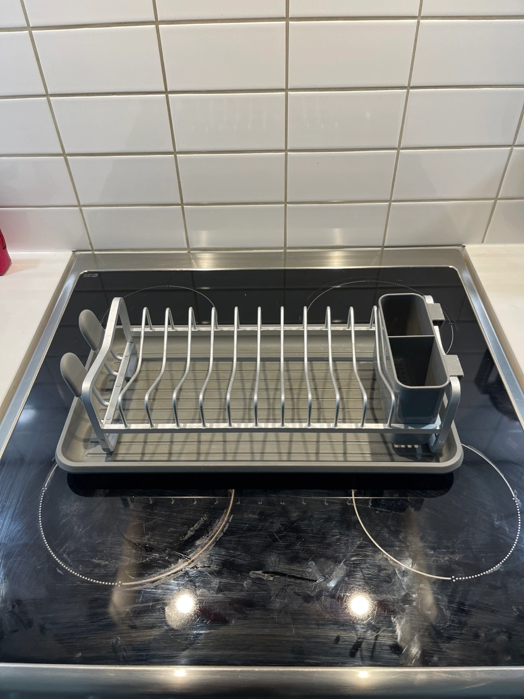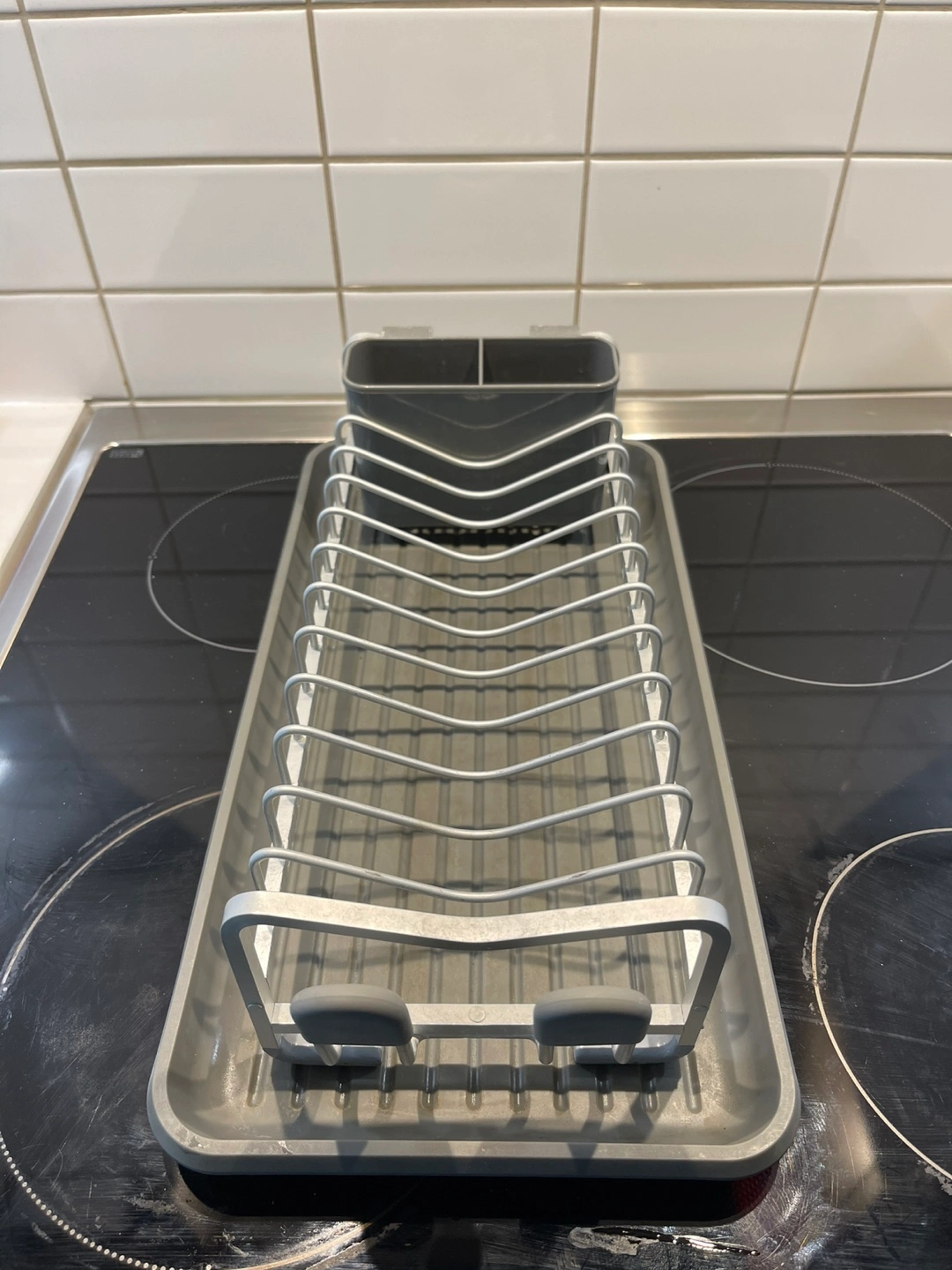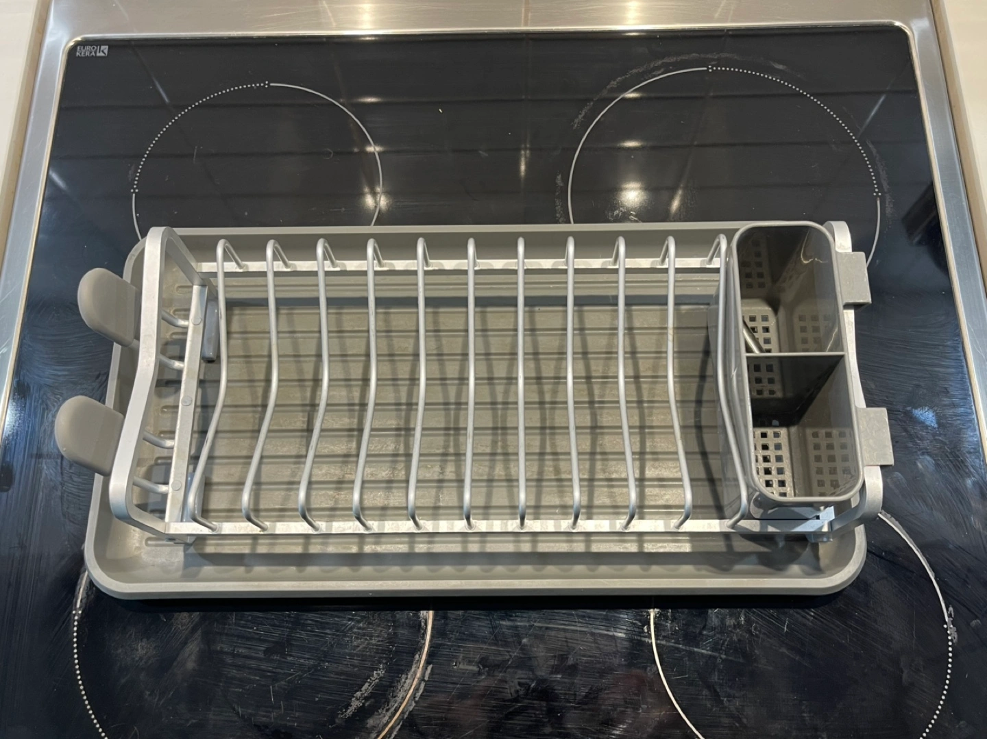 Moving out sale. Compact dish rack. Features a utensil holder. Grey plastic tray and silver metal frame.