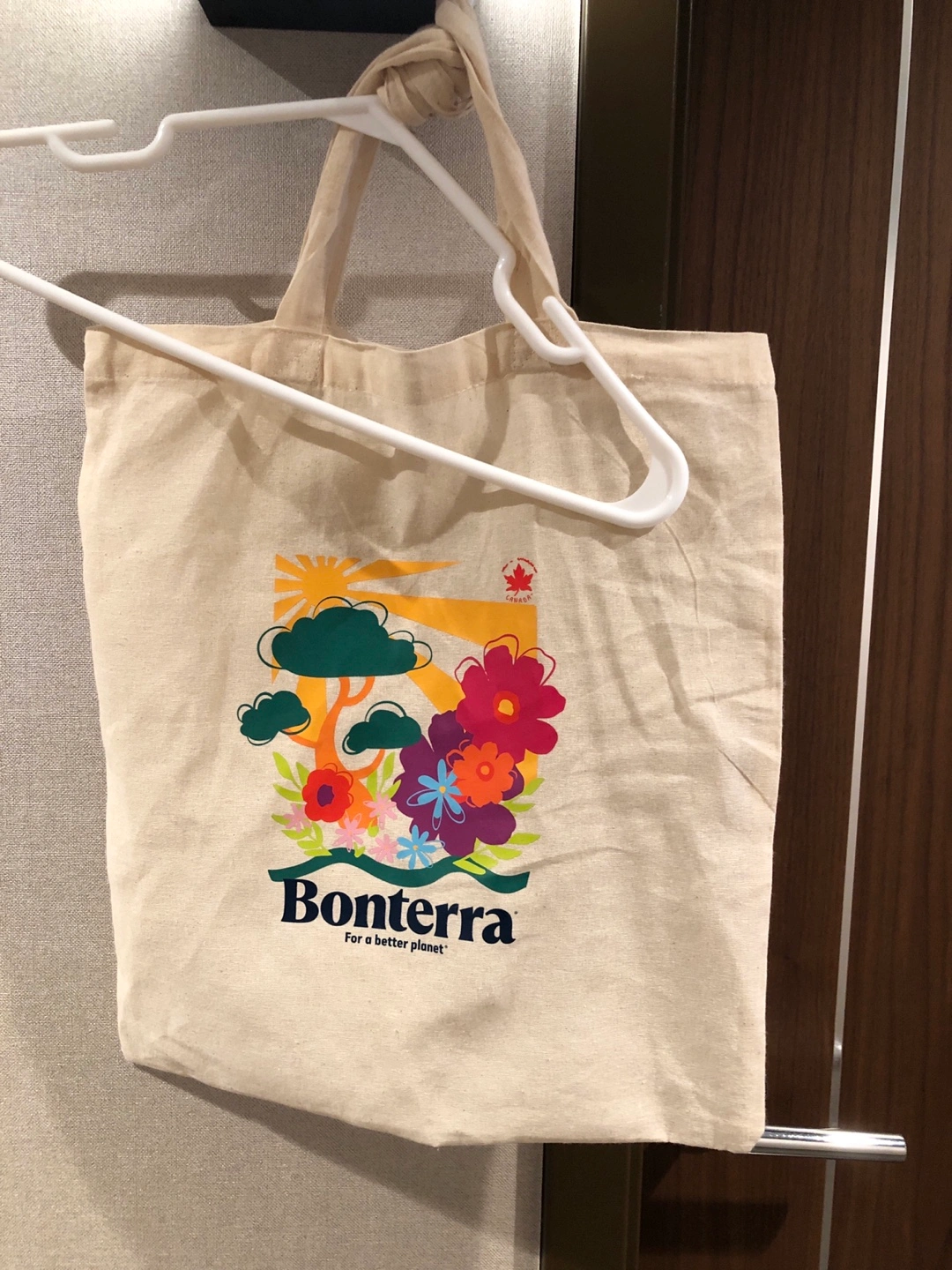 Reusable tote bag. Features floral design. Made of beige cotton. Great for shopping or everyday use.
