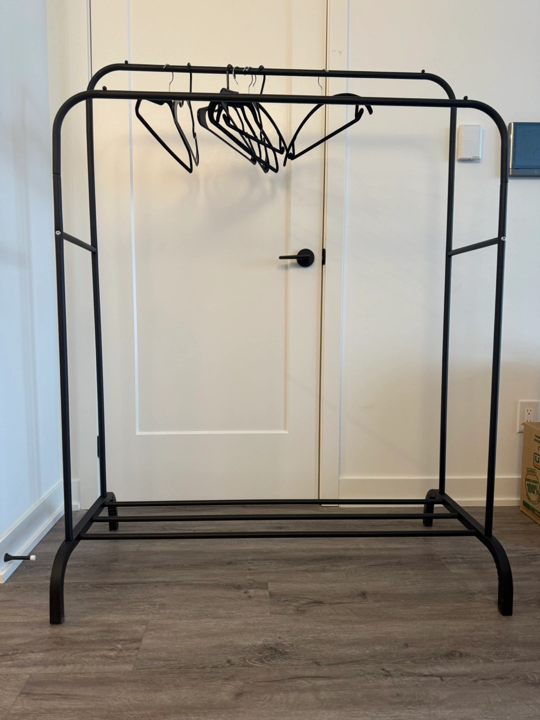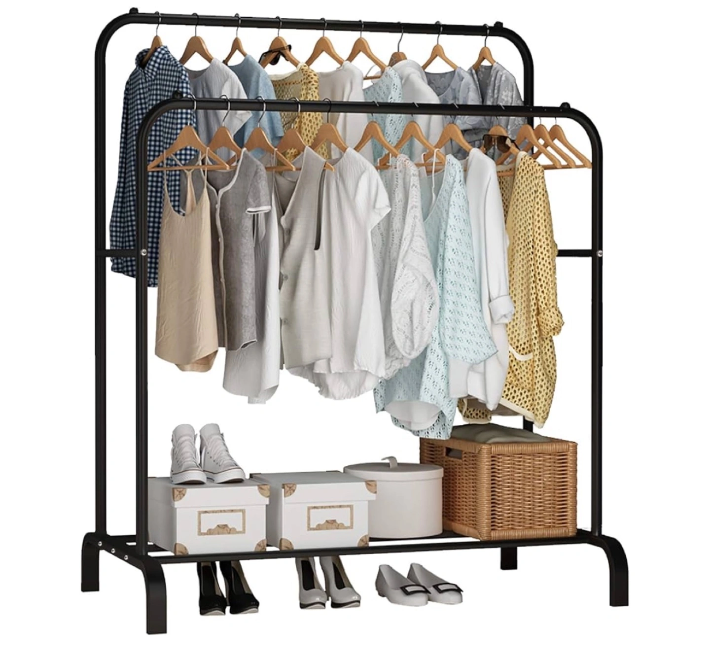 Sturdy black metal clothing rack. Two hanging rods. Lower shelf for storage. Ideal for organizing clothes and shoes. Purchased Jan, no place to keep.