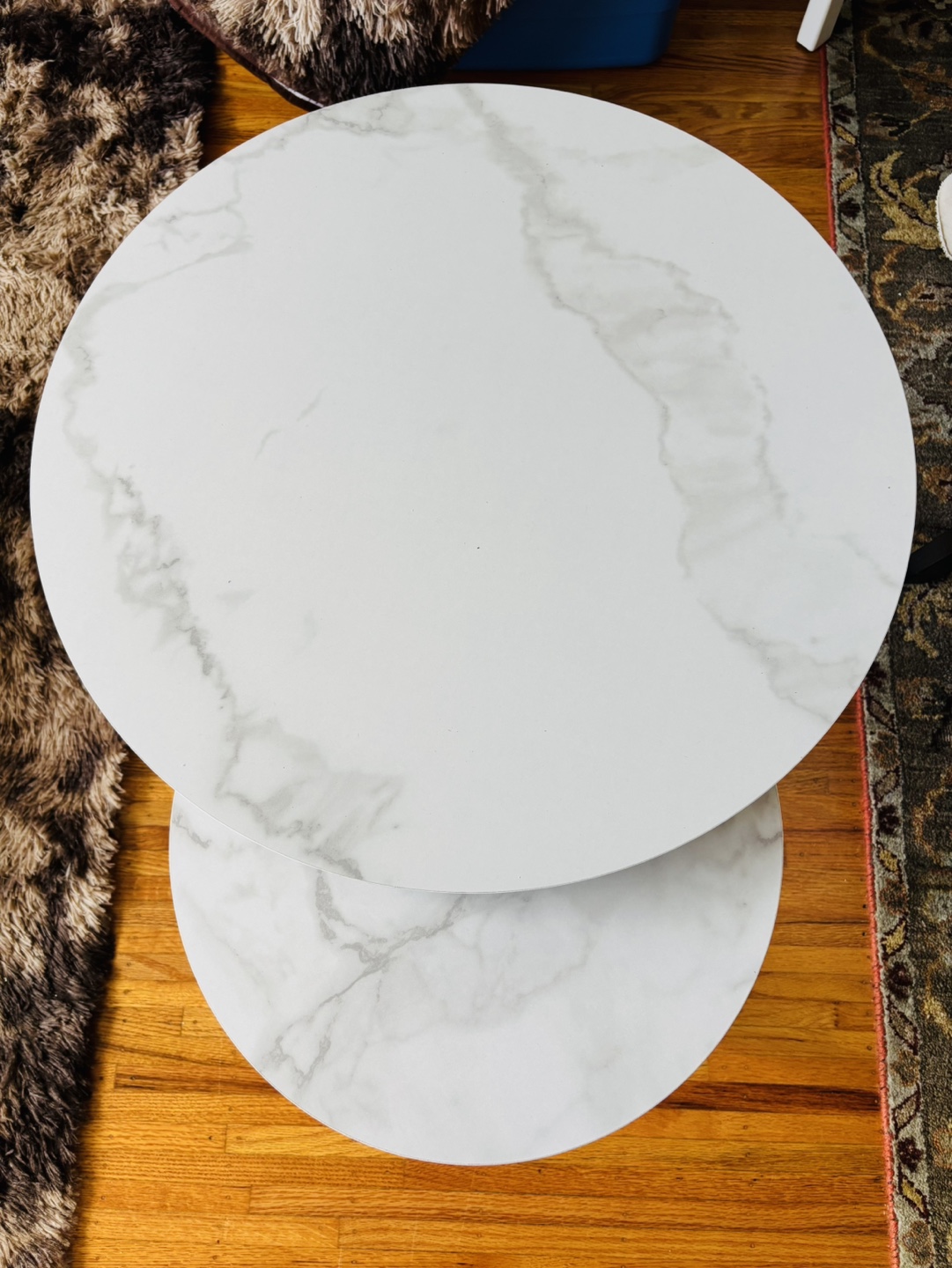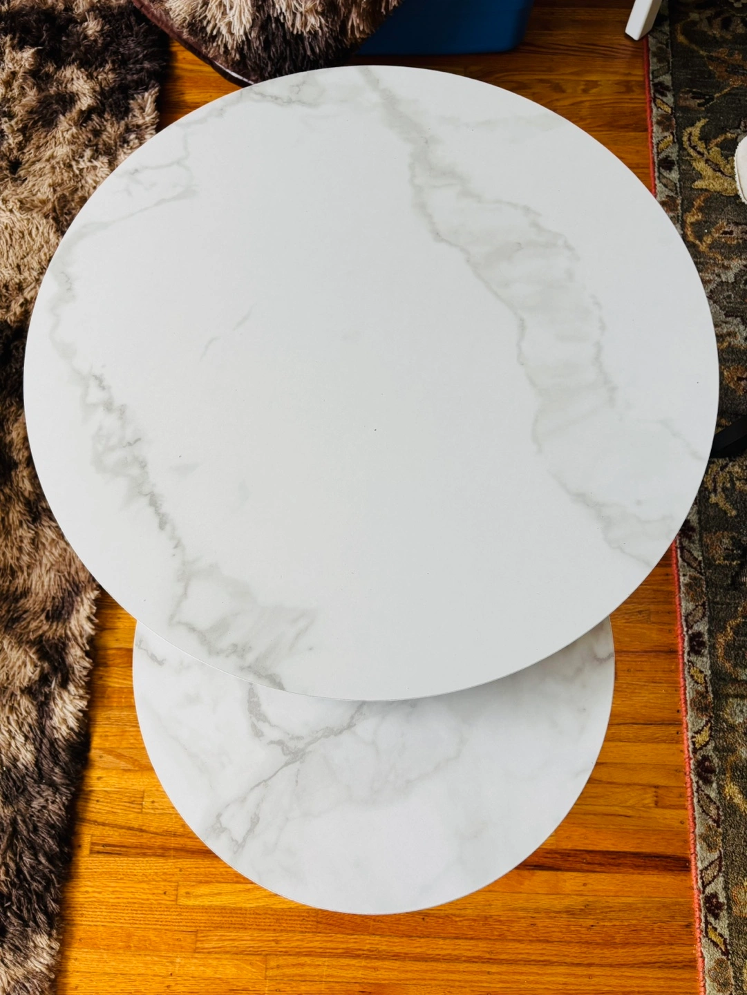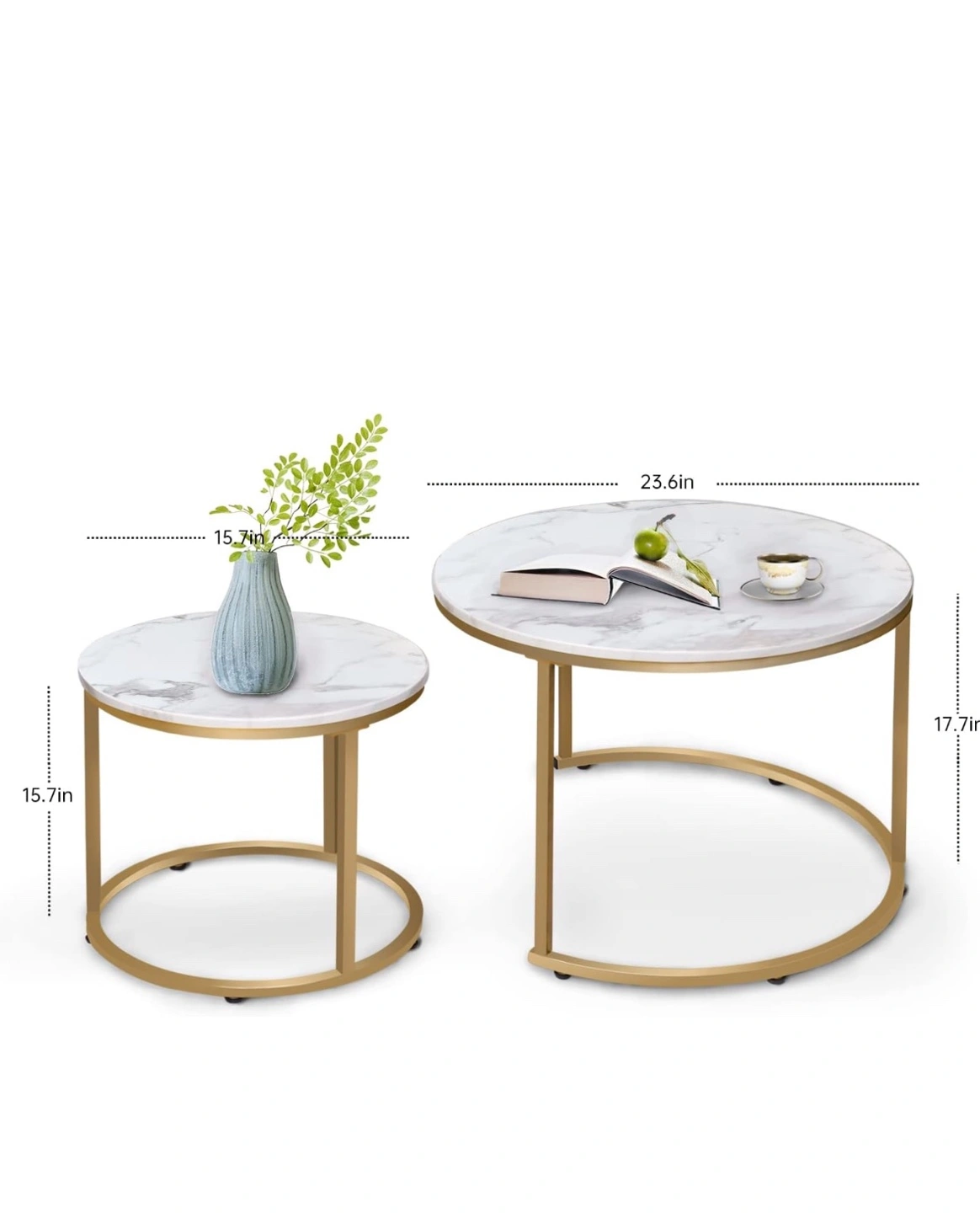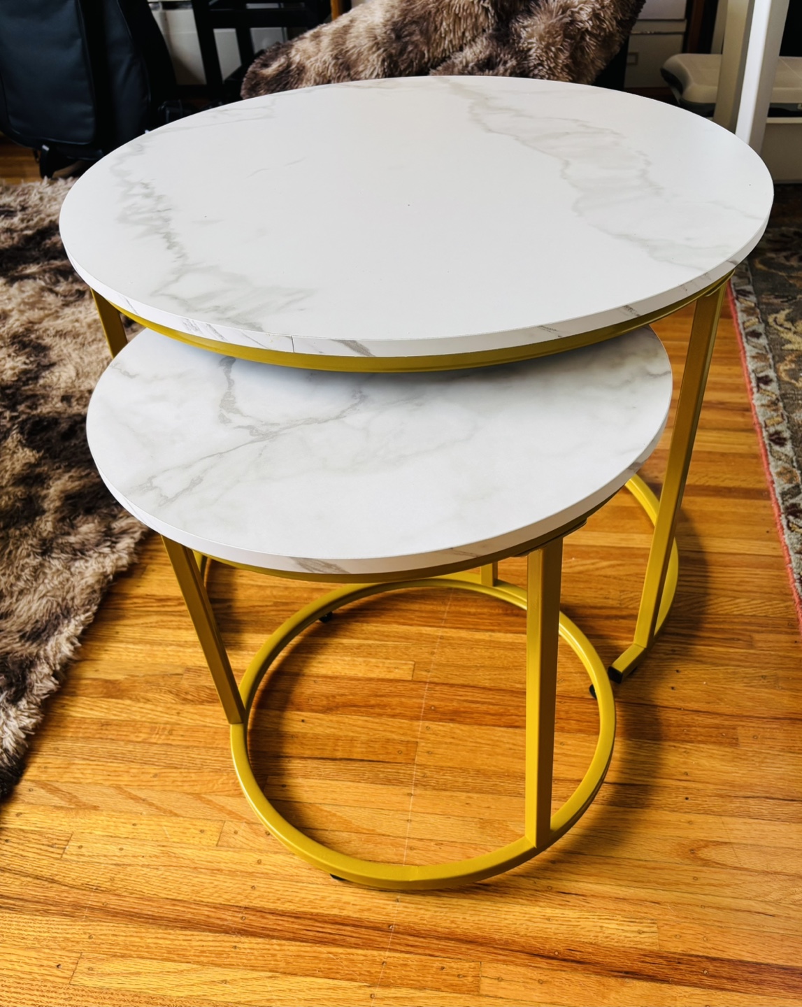 Set of two round nesting tables. Marble-look tabletops. Gold coloured metal frame. Perfect for small spaces. Minimalist design.