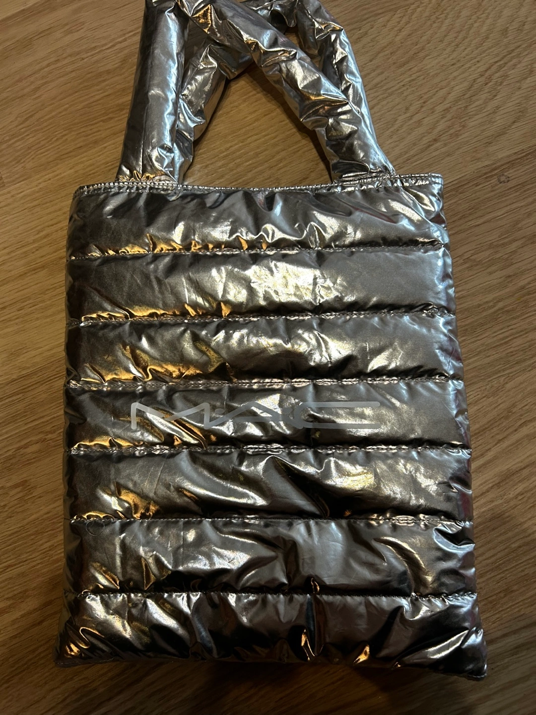 Silver metallic puffer tote bag. Small, lightweight design. Features the MAC logo.