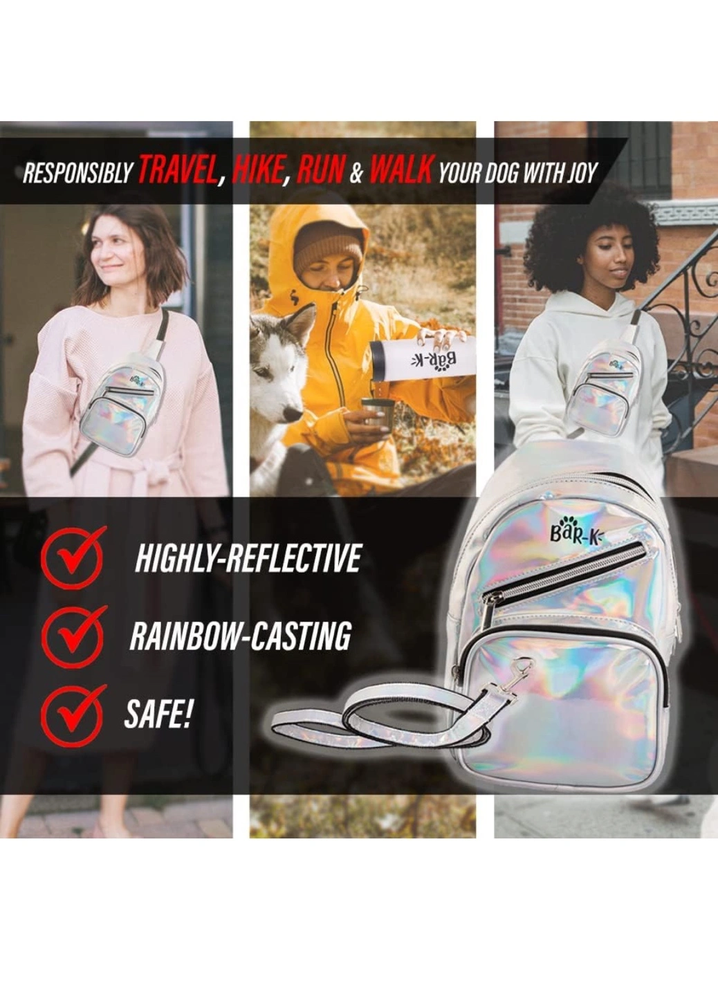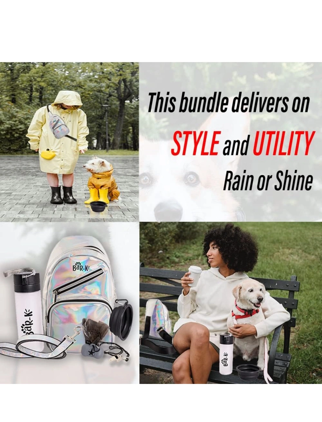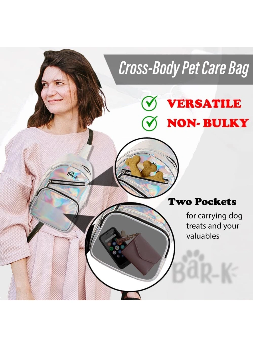 Stylish holographic crossbody bag. Includes collapsible bowl, leash, poop bags, dispenser, whistle, and water bottle. Perfect for walks! Versatile and convenient. I added 400 disposable doggie bags for free.