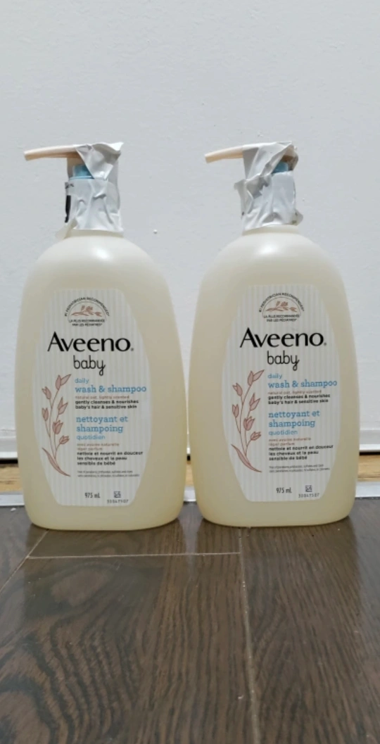 Two bottles of Aveeno Baby Daily Wash & Shampoo. Gentle cleanser nourishes baby's hair and sensitive skin. Pump bottles, 975ml each.