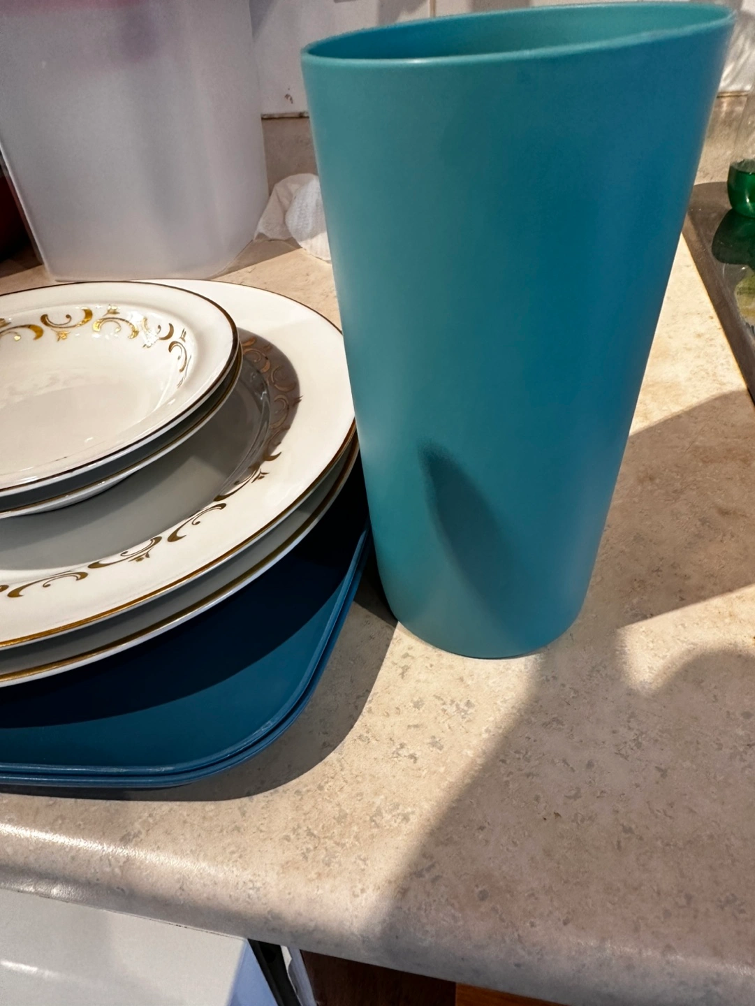 Large pasta-themed bowl. Set includes plates and bowls with gold trim. -2 Teal plastic plates-2 and big glass , 5 small glasses Good condition.