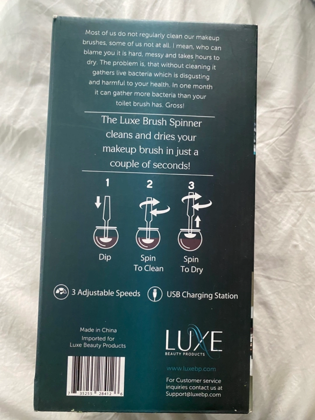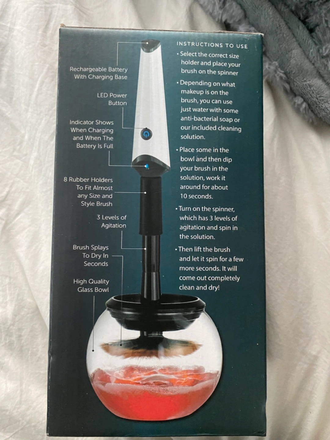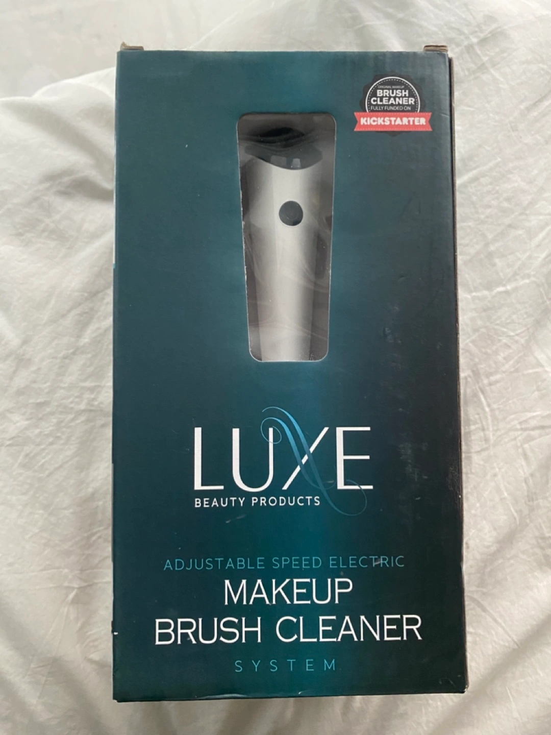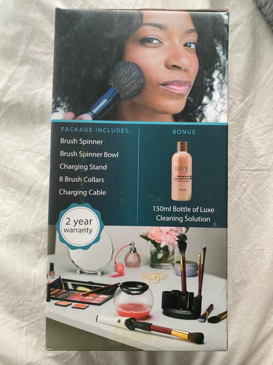Never used (new in box) electric makeup brush cleaner. Includes brush spinner with 3 adjustable speeds, bowl, charging stand, 8 brush collars, usb charging cable, and a 150ml bottle of Luxe cleaning solution.