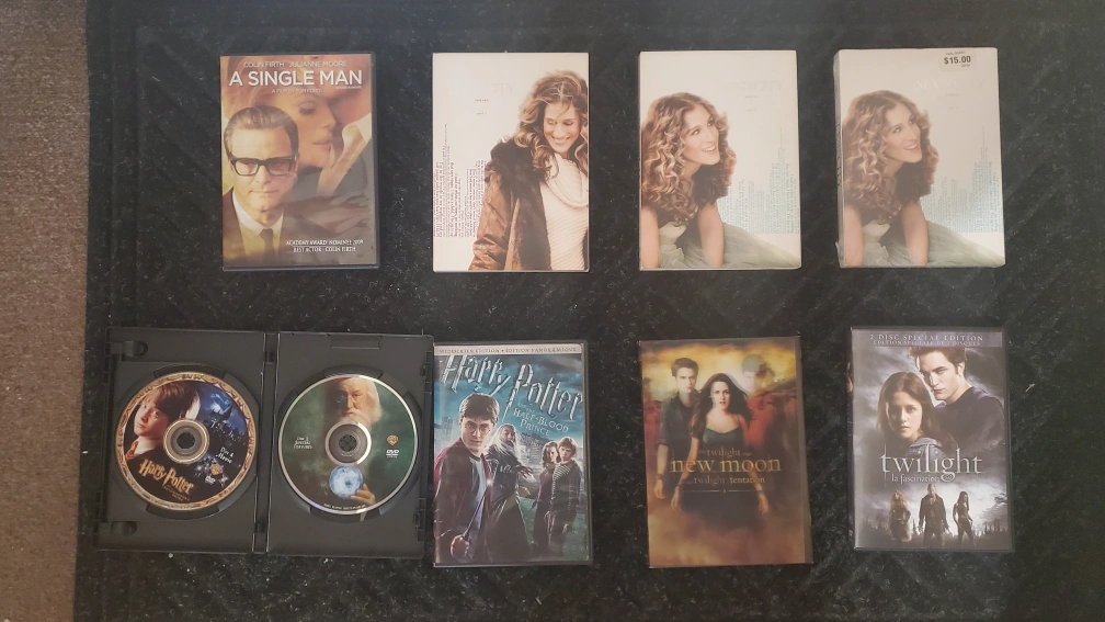 142Collection of DVDs including: A Single Man, Sex and the City, Season 6, Part 1 Sex and the City, Season 6, Part 2 (opened) Sex and the City, Season 6, Part 2 (unopened) Harry Potter and the Philosopher's Stone (2-part disc only), Harry Potter and the Half-Blood Prince, The Twilight Saga: New Moon, and Twilight Whole set for $5. Good, used condition. Except for unopened Sex and the City, which is Like New. Cash only. Delivery extra.