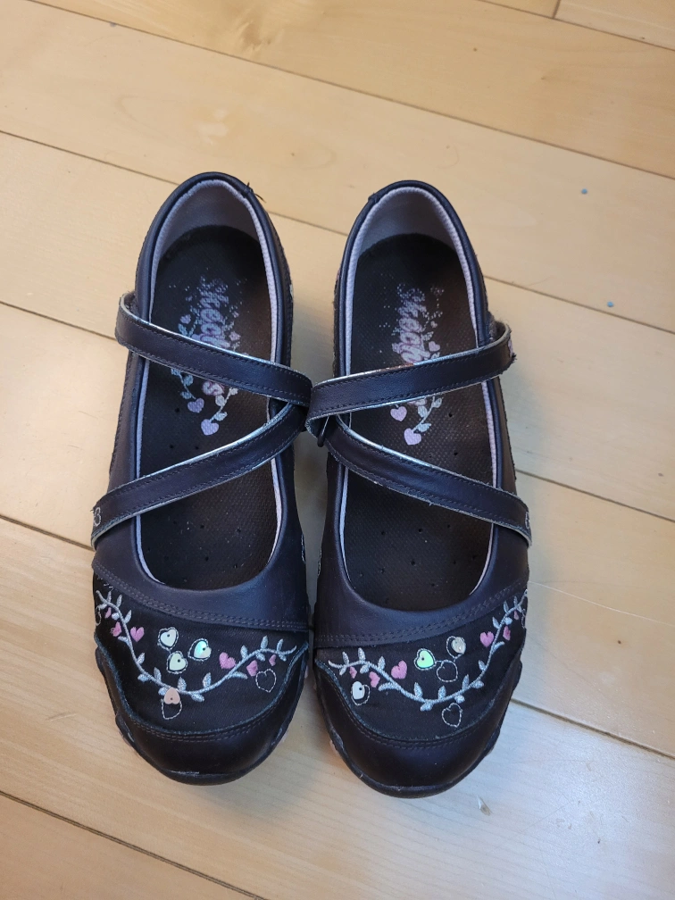 Dark brown leather-like Skechers Mary Jane shoes. Embroidered floral accents. Double strap closure. Good condition. Suitable for girls size 4 US, EUR 36