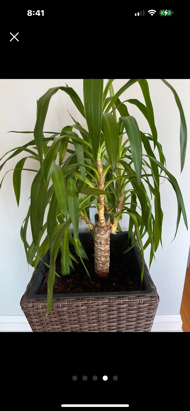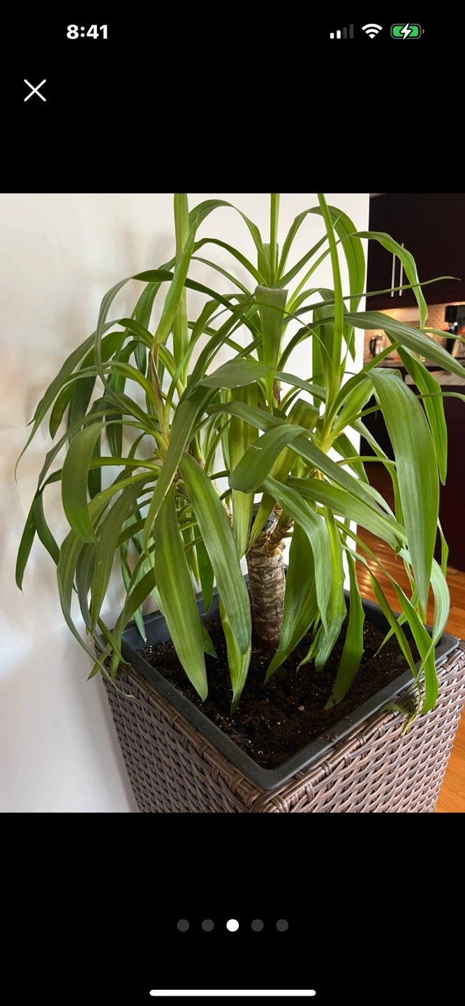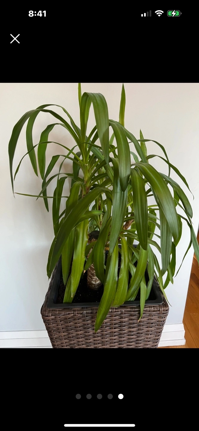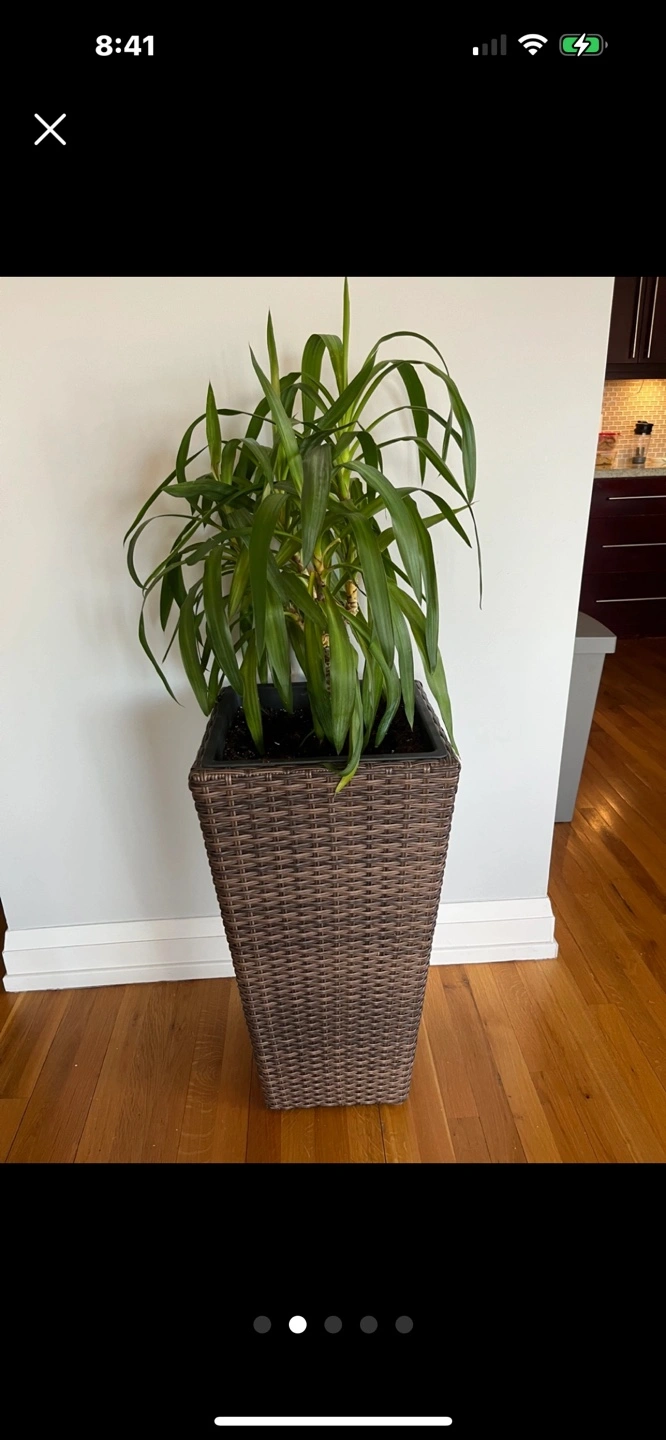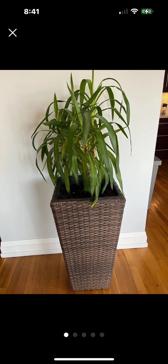 Healthy Yucca plant in a good quality brown wicker-style planter. In a self contained pot that fits inside the wicker planter. Great addition to any home. Planter is tall and in excellent condition.
