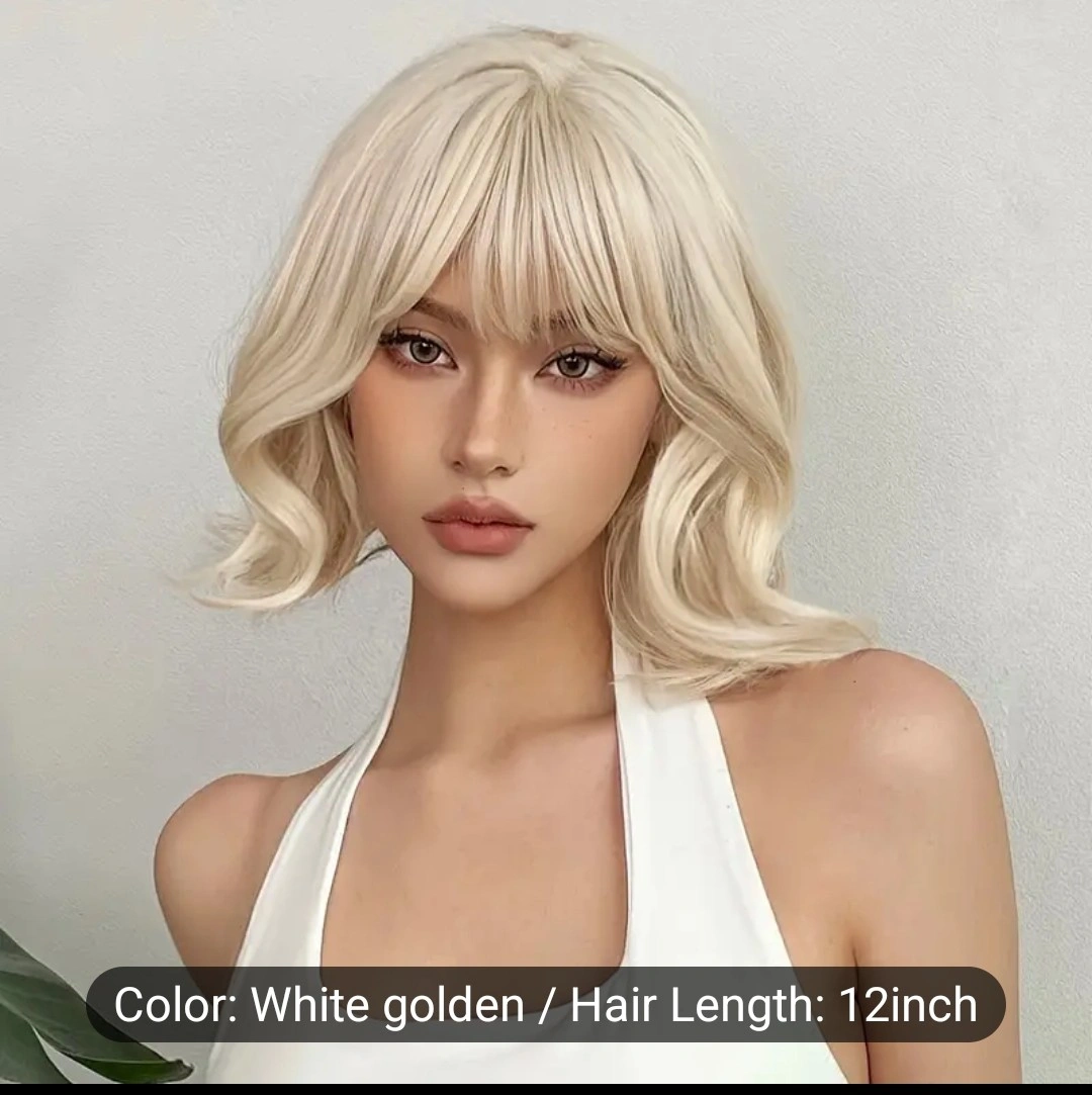 White-gold blonde wig. 12 inches long. Short, wavy style. Features bangs.