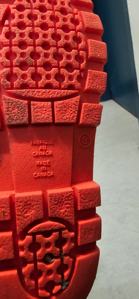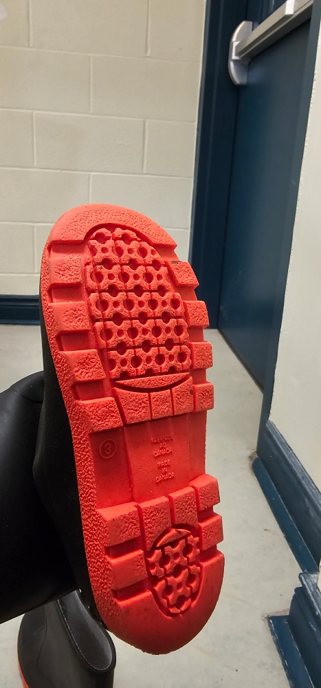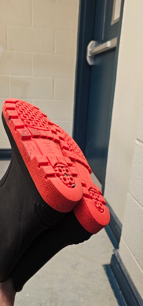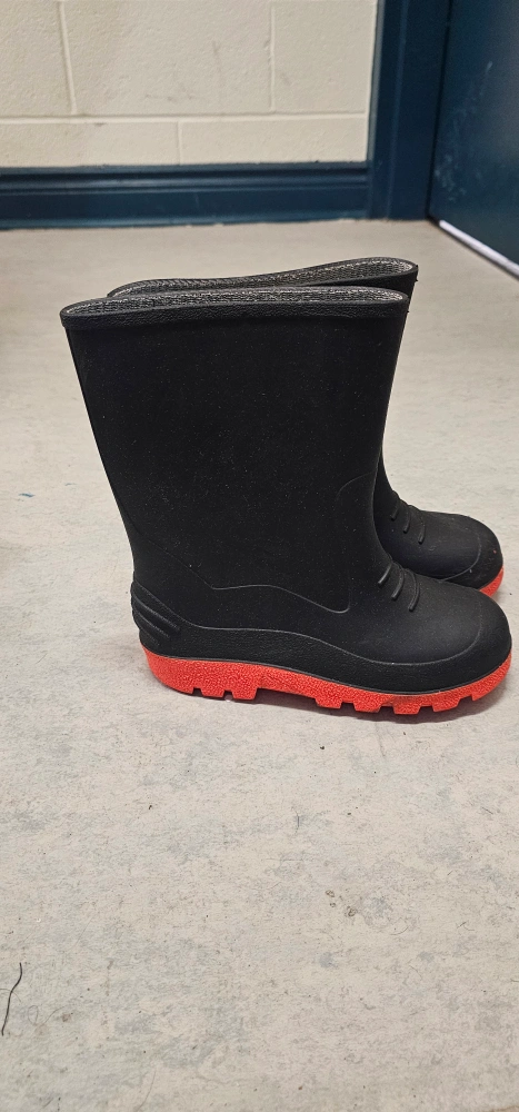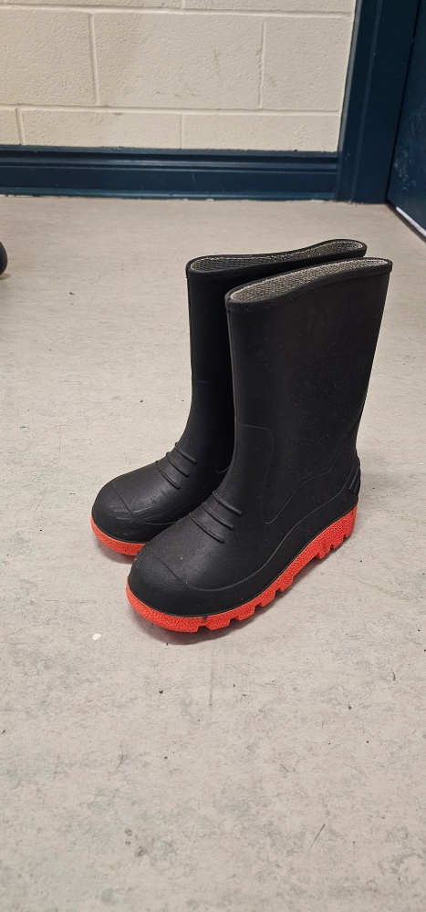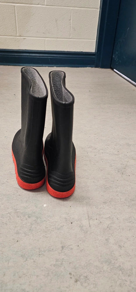 Pair of black rubber boots. Orange soles. Good for rainy days. Size not specified.