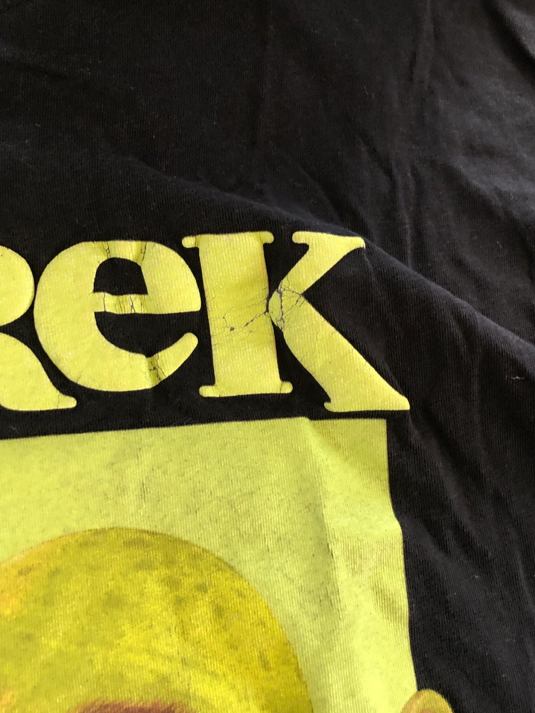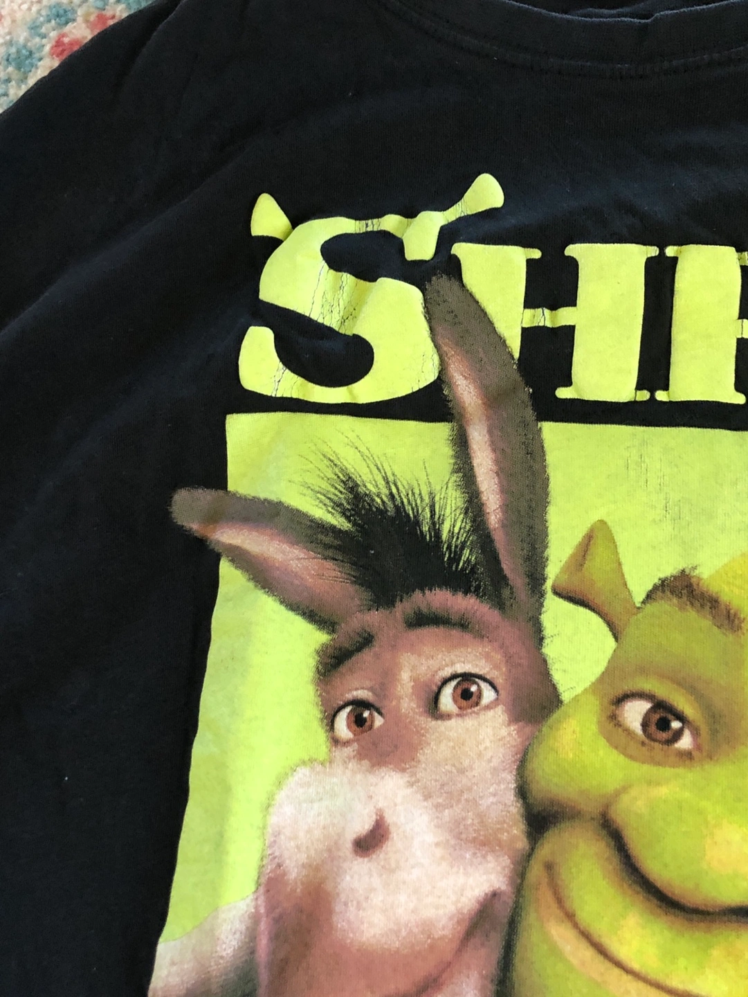 Black Shrek t-shirt. Features Shrek and Donkey. Text reads "Shrek" and "Living My Best Life". Shows some minor wear.