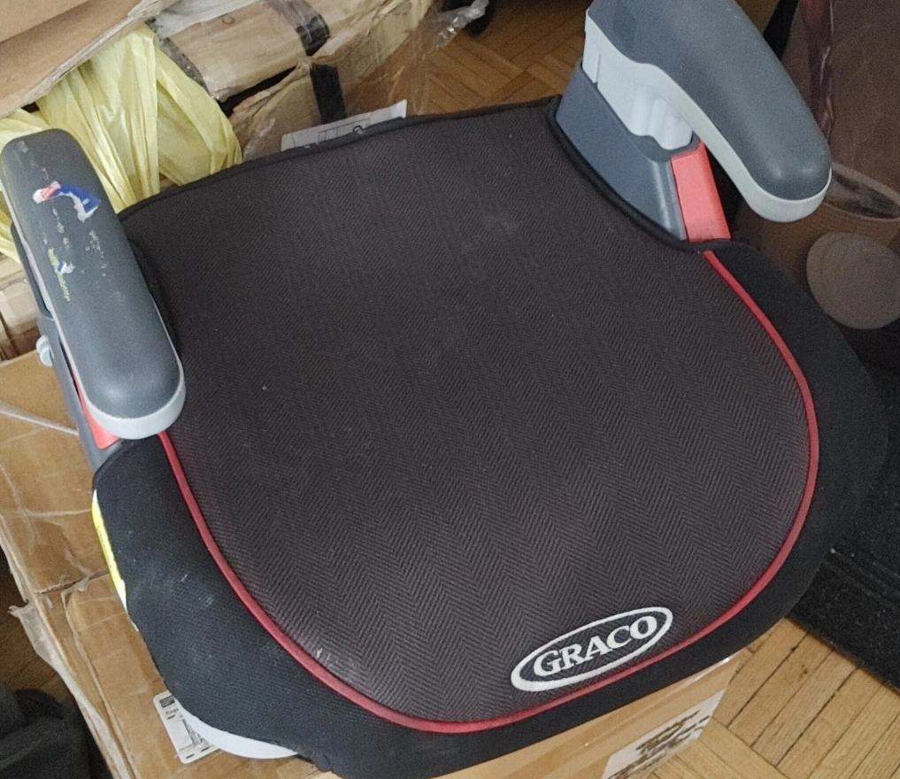 Used car booster seat. Black fabric with red trim. Armrests included.