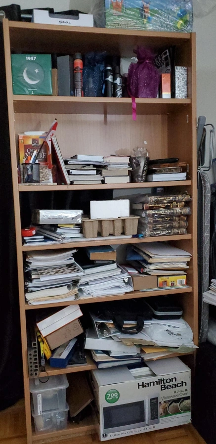 Used wooden bookshelf, five shelves, lots of storage space. Currently full of various items, including books, papers, and a boxed microwave. Buyer responsible for emptying the shelves.Measurements 37 inch Wide, 82 inch High and 13 inch deep