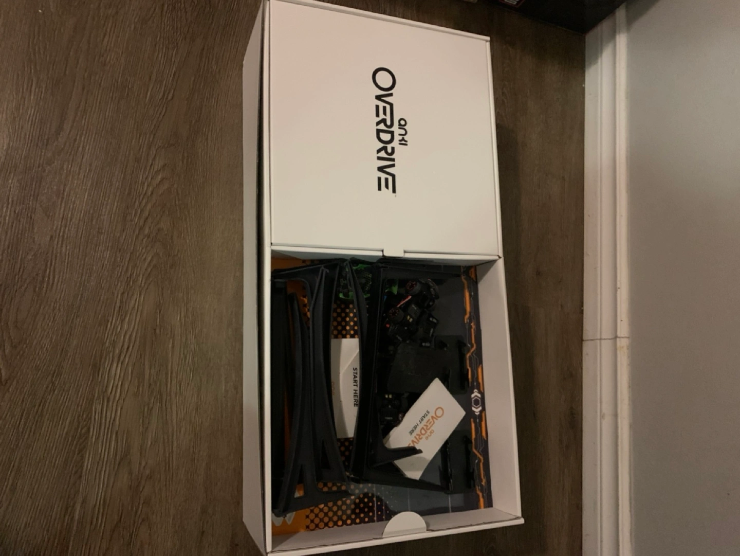 Complete Anki Overdrive racing set. Includes four cars, all track pieces, different style plugs, tire cleaner, wireless car charger and all.