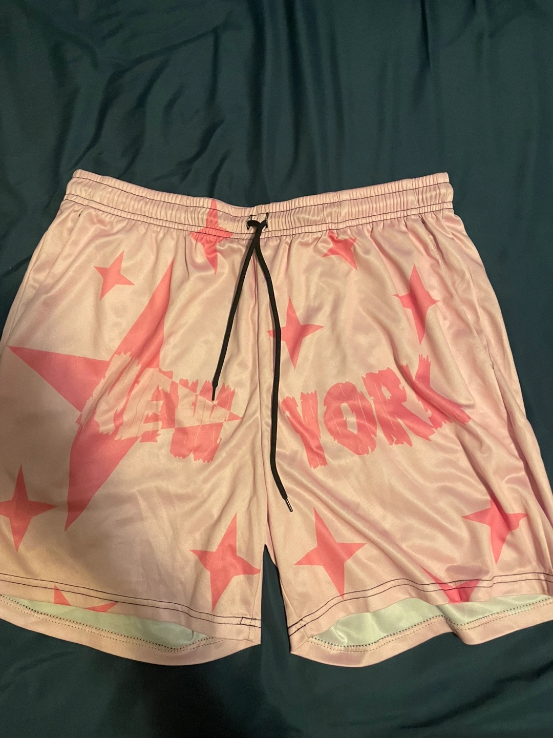 Men's large shorts. Pink with pink stars and a New York City graphic. 100% polyester. Machine wash cold. Used 1 time for 2 hours only