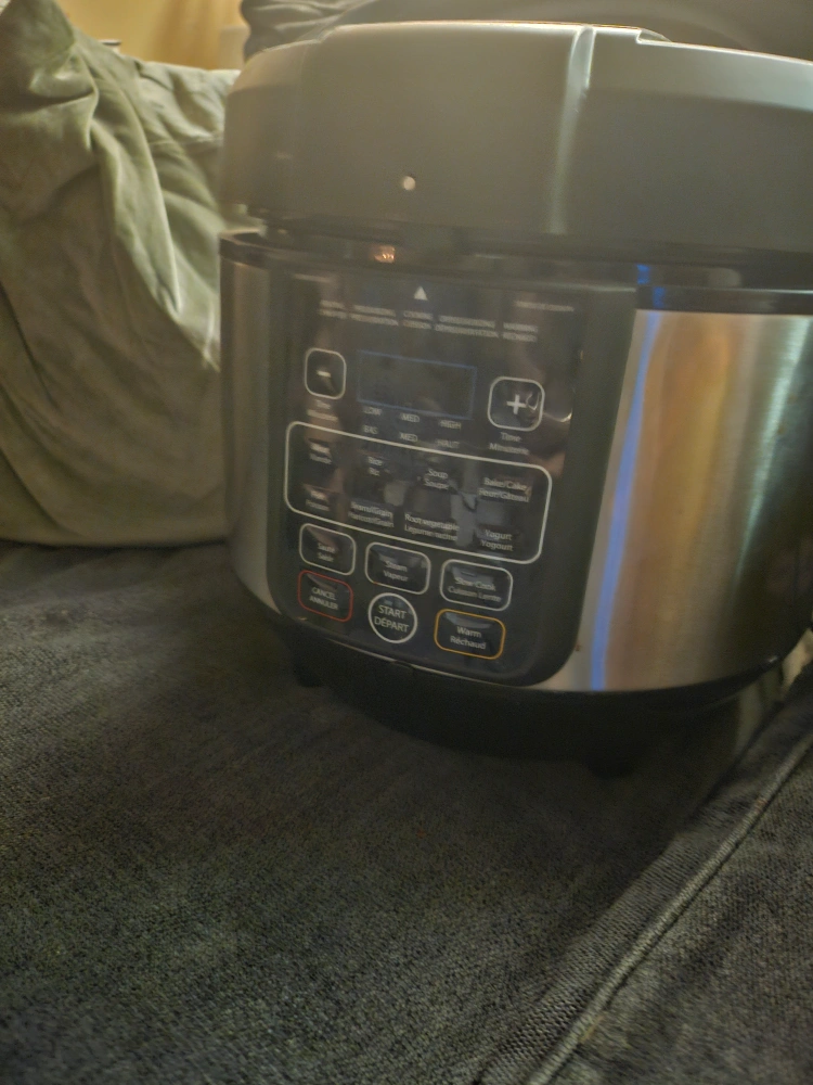 Stainless steel multi-cooker. Multiple cooking functions: pressure cooking, slow cooking, steaming, sautéing, and more. Digital control panel. Good condition.