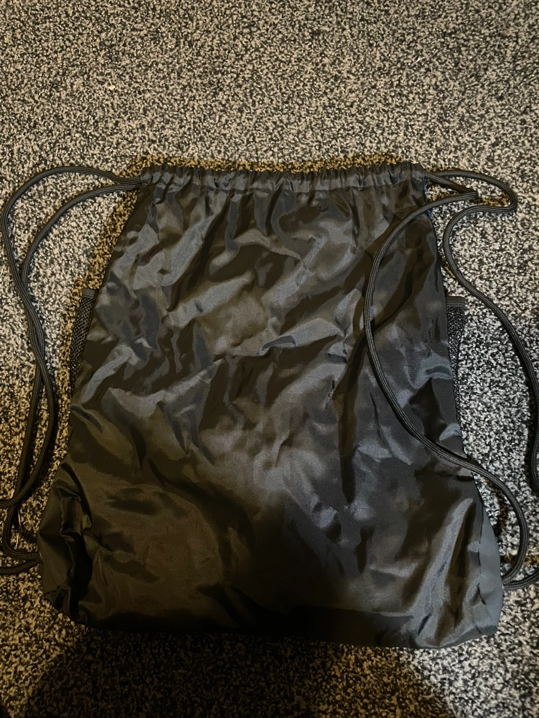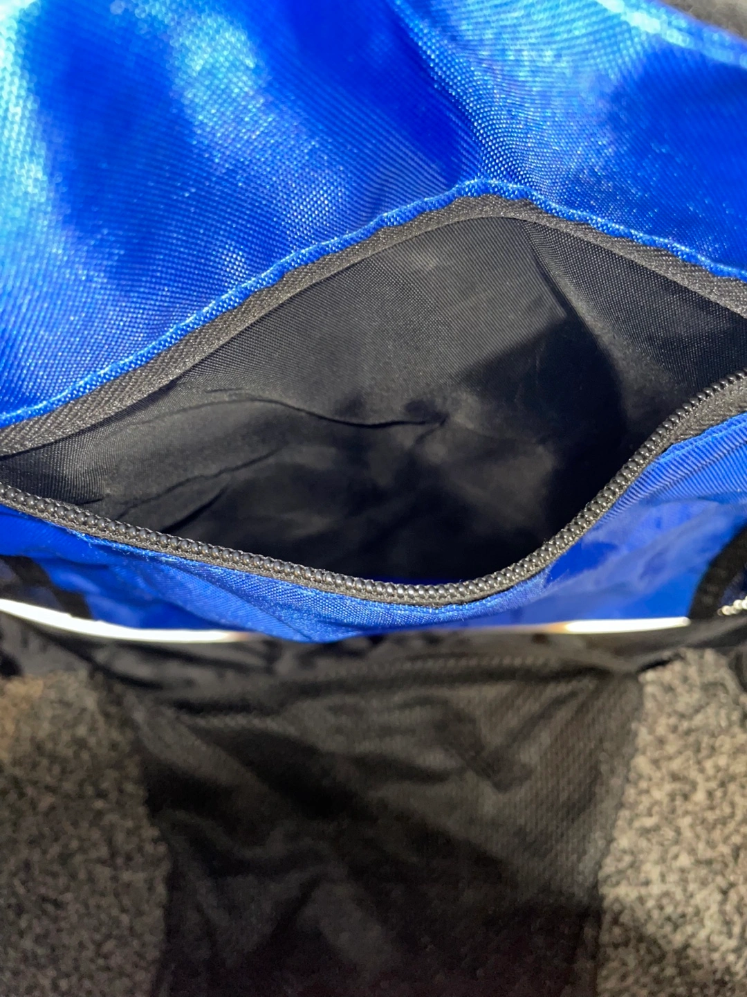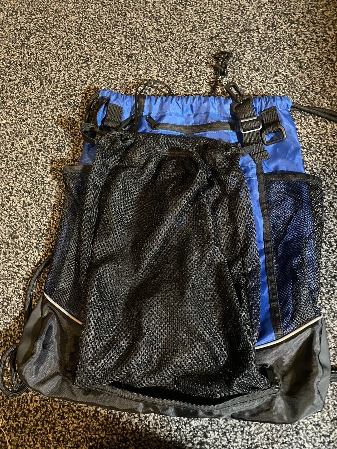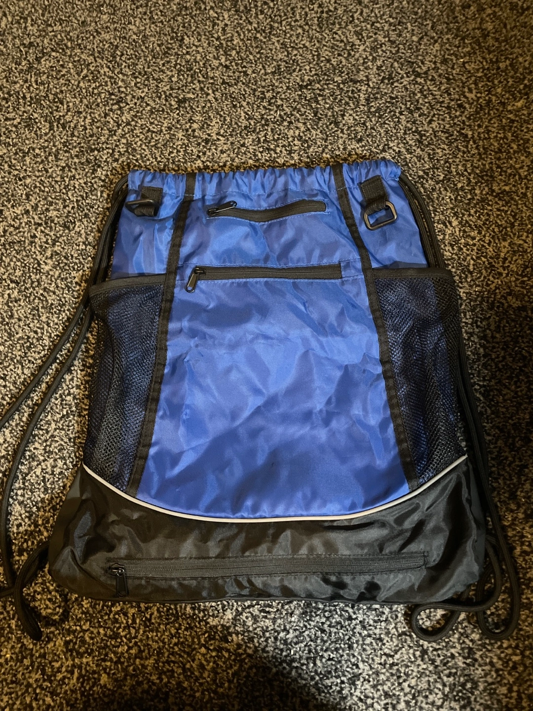 79Drawstring backpack. Blue and black colour. Ideal for gym, sports or travel. Hidden ball mesh compartment on the bottom zipper. 2 zippers for storage and 2 side water bottle pockets