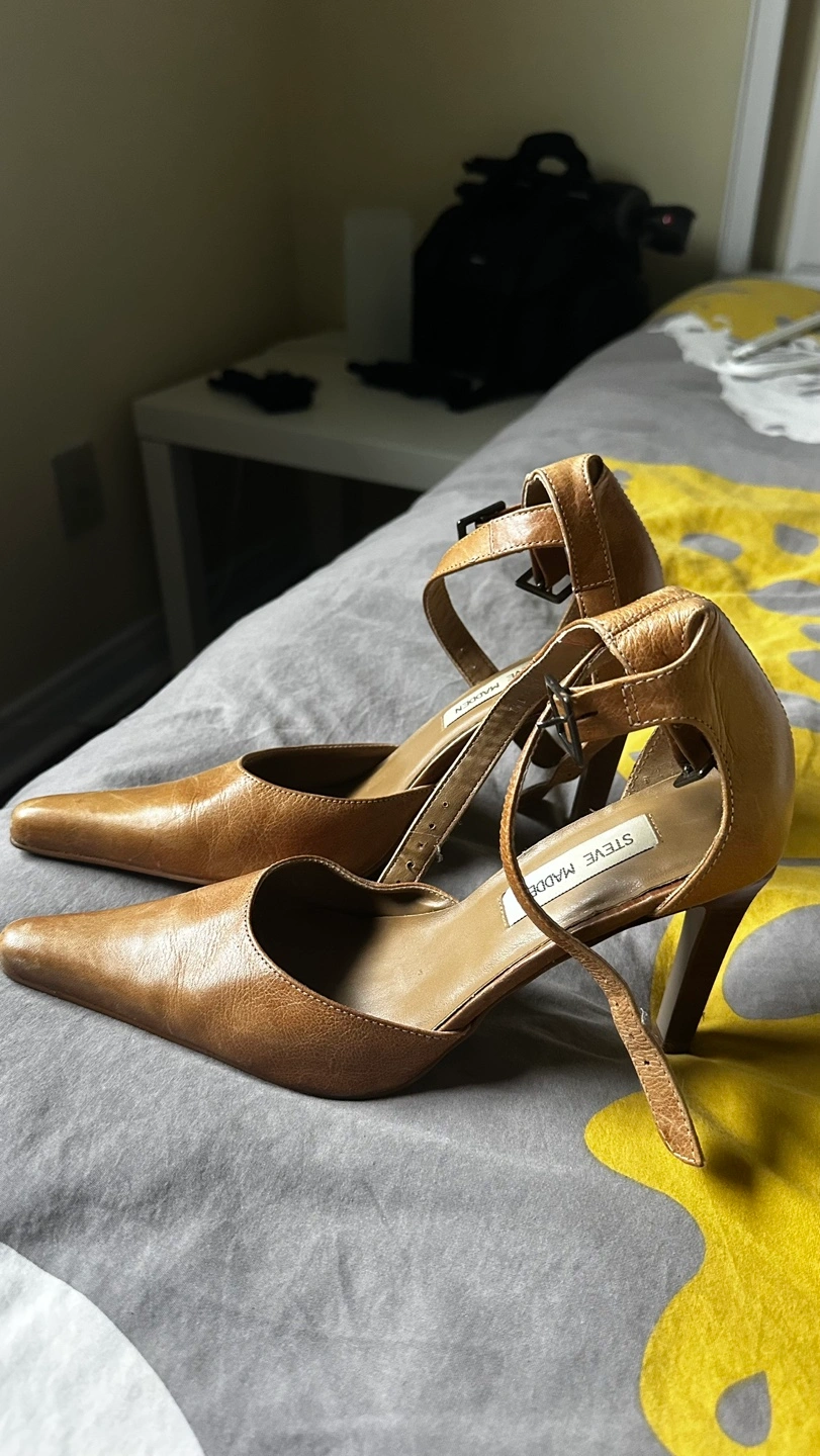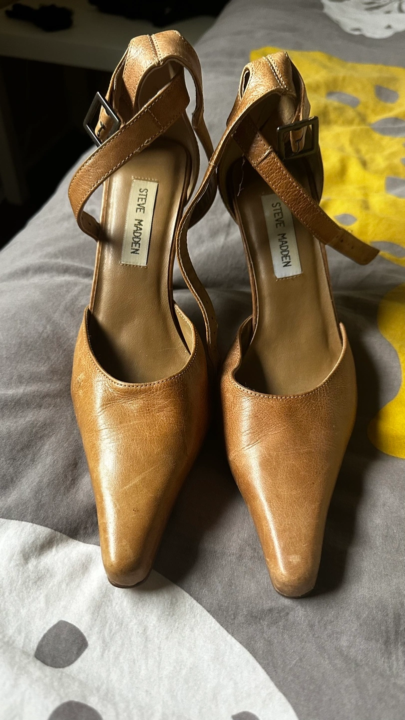 38Steve Madden Tan leather heels, pointed toe, ankle strap. High heels, great for a night out. Pre-owned. Size 8 Cash only Mississauga pick up only