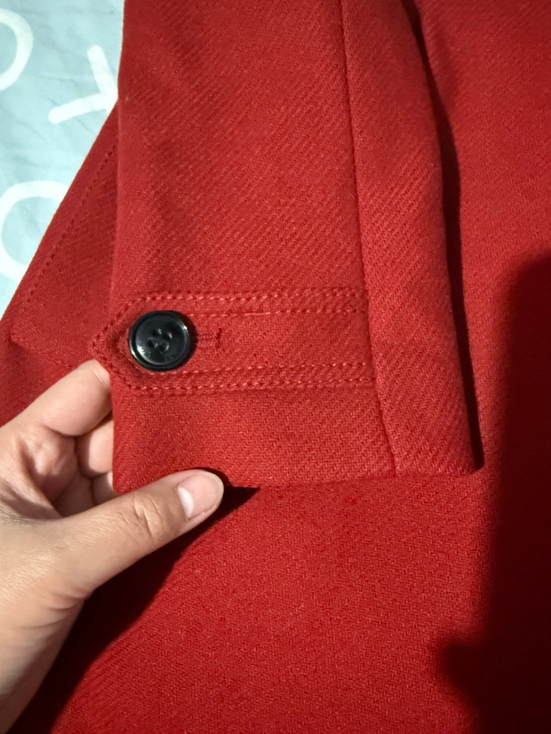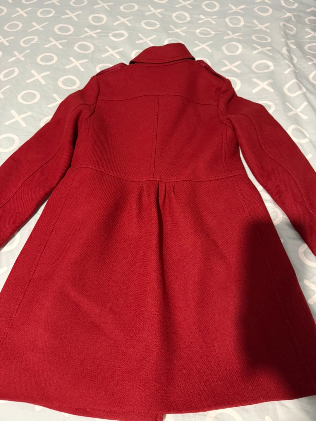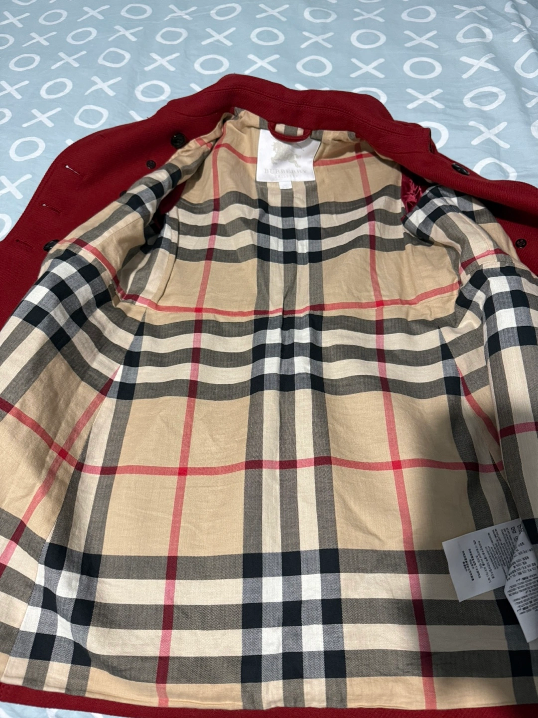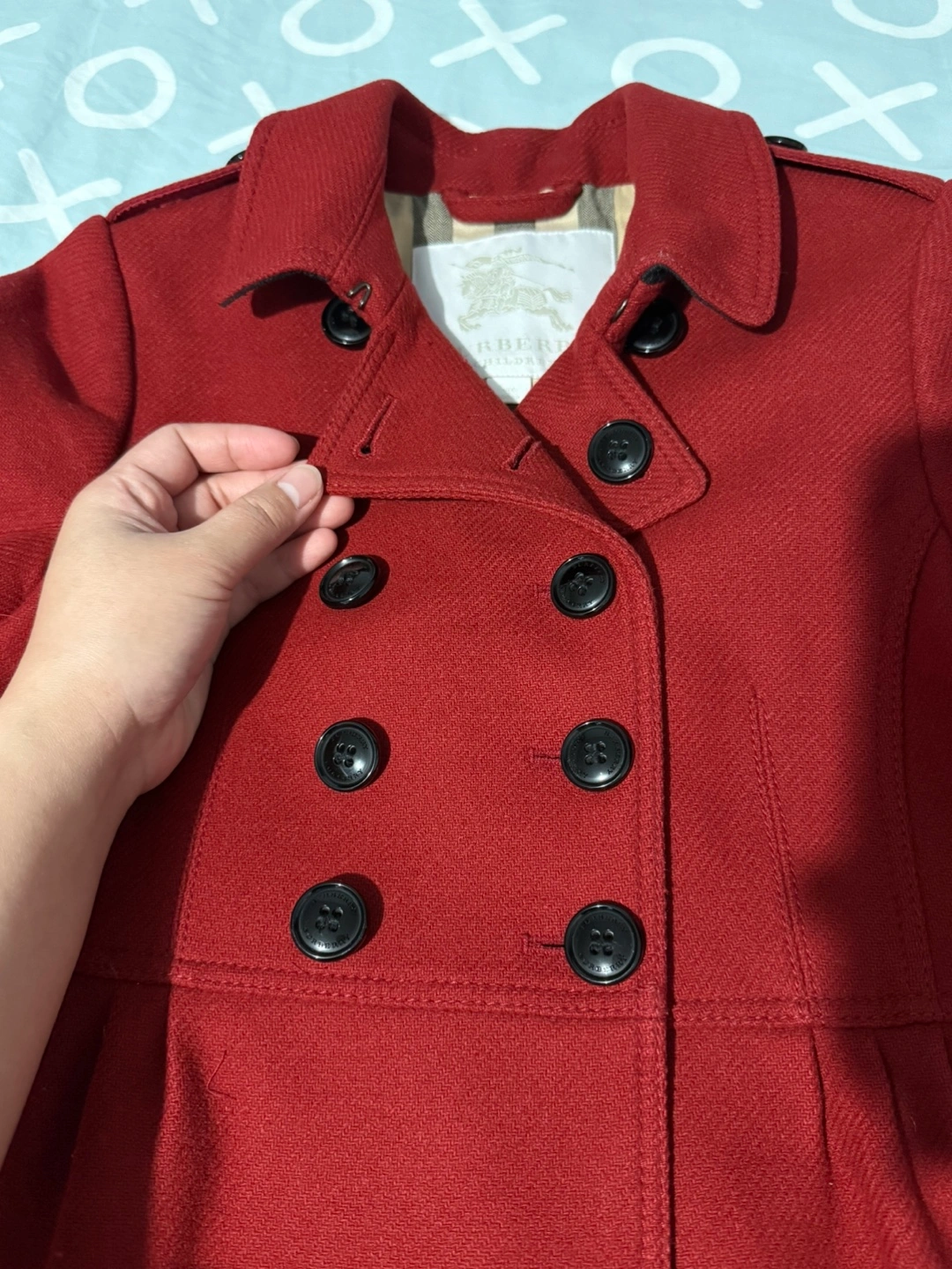 Adorable red coat. Double-breasted design. Features a classic Burberry check lining. Excellent for colder weather. Like new!
