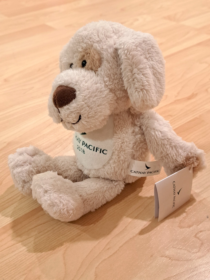 Adorable beige plush dog. Features Cathay Pacific logo. Small, collectible item. Perfect for aviation enthusiasts or children.