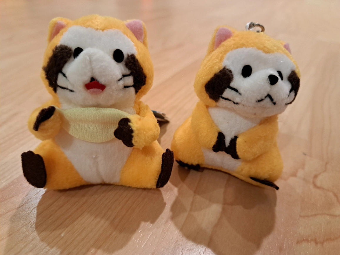 Pair of cute plush raccoon keychains. Small and collectible. One raccoon holds a small yellow object. Original tag included.