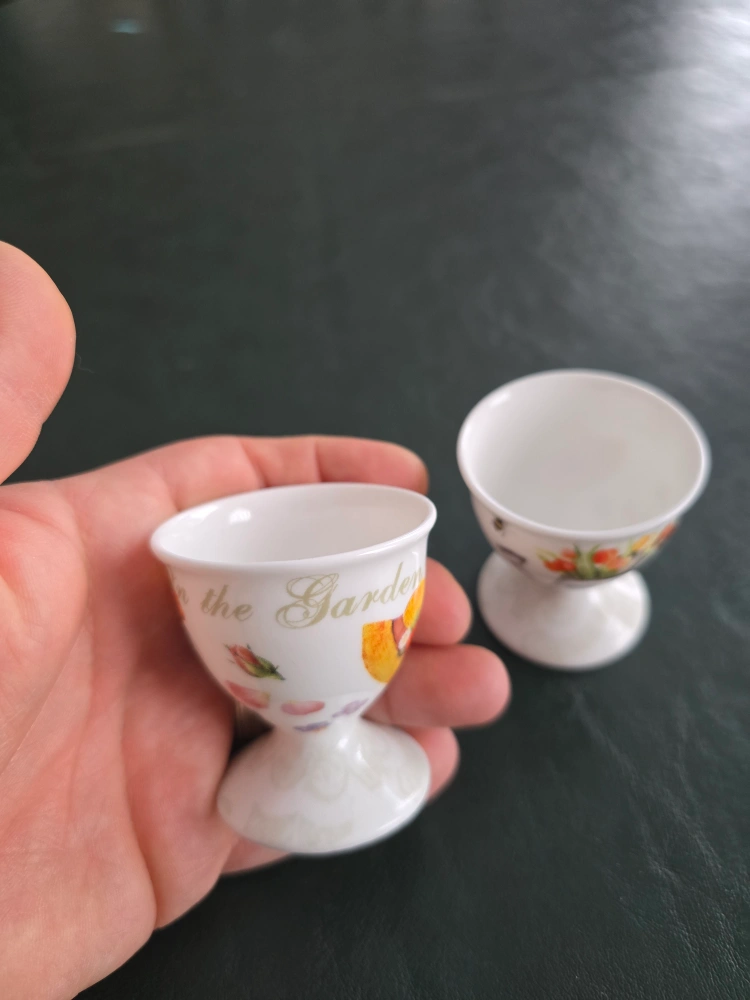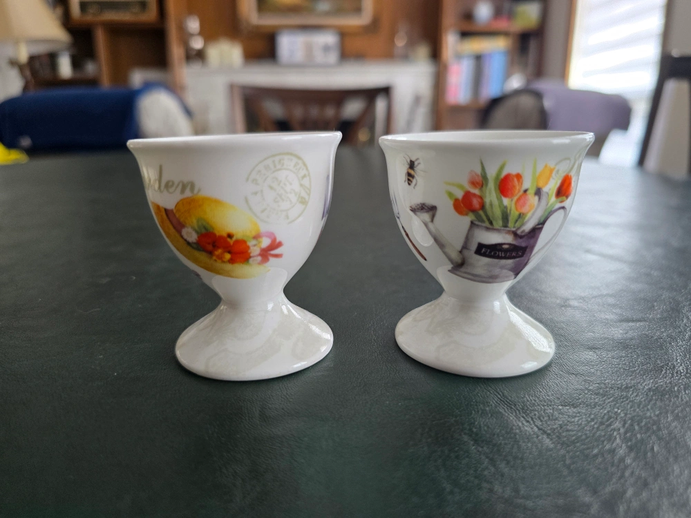 Two charming egg cups. Adorable floral and garden theme. Perfect for Easter or everyday use. White porcelain with colourful prints.