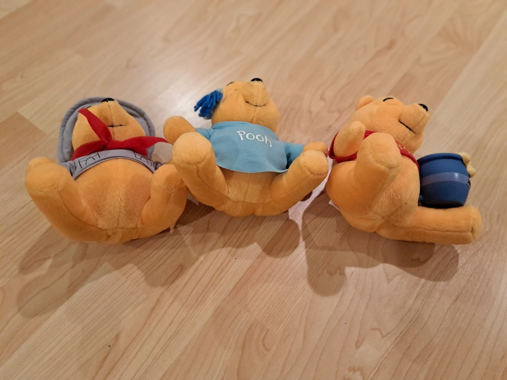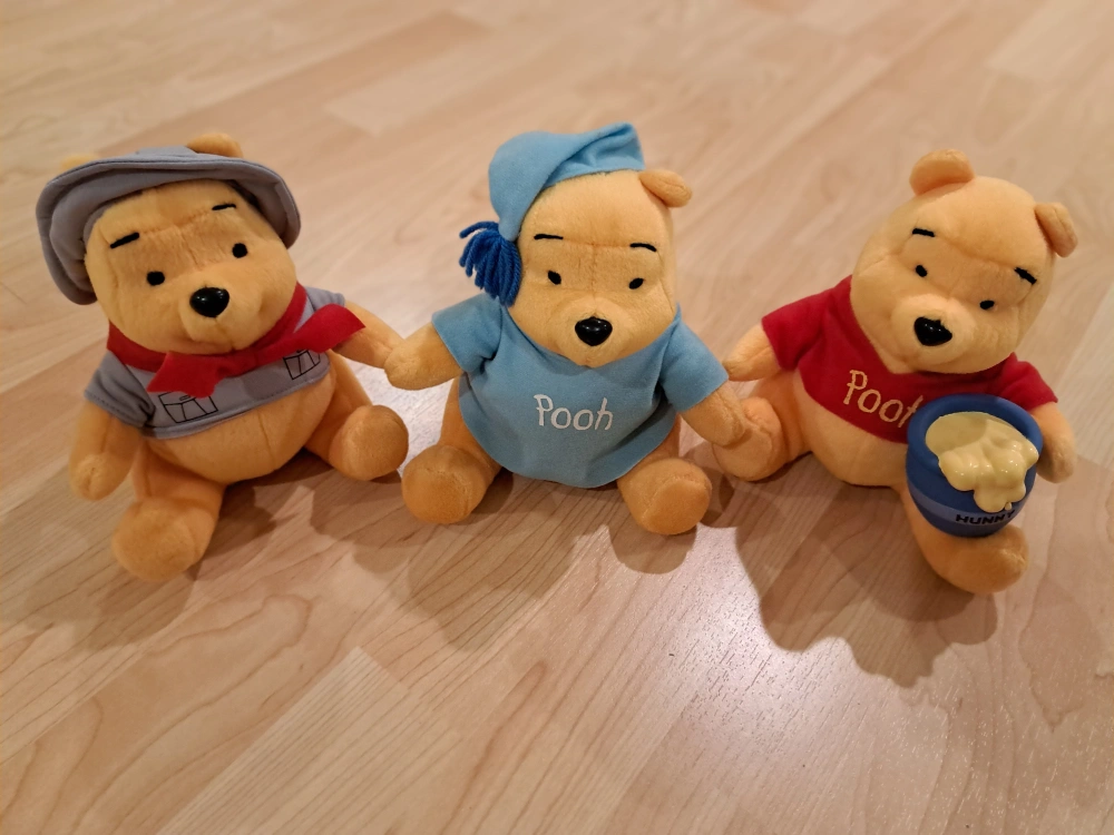 570Set of three 7" Winnie the Pooh plush toys. Each bear wears a different outfit. Collectible.