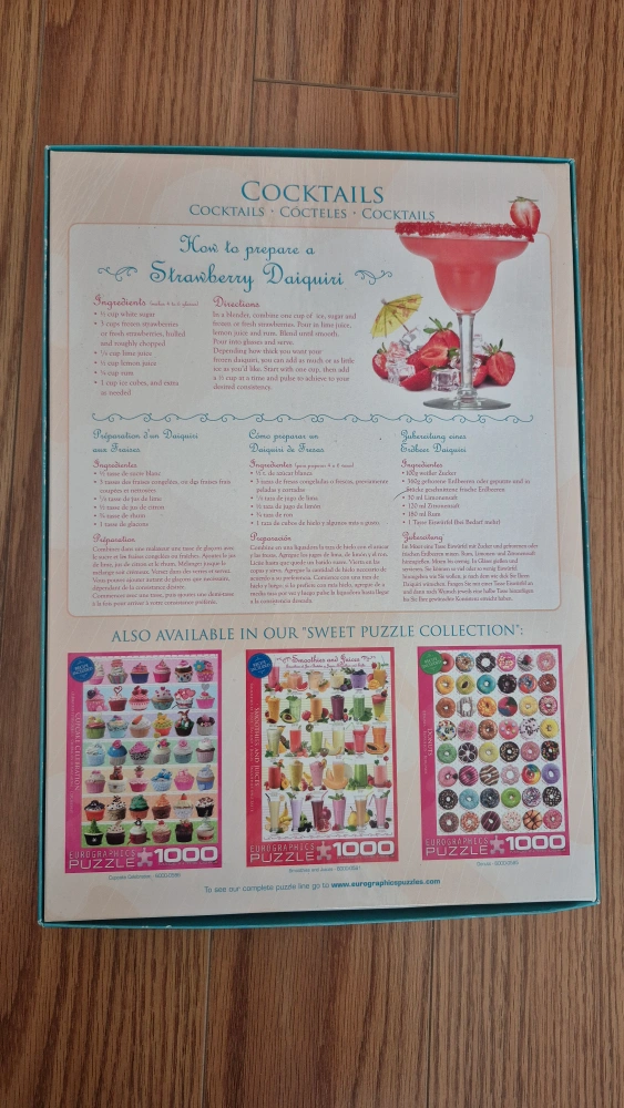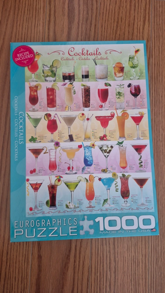 A colourful 1000-piece jigsaw puzzle with cocktails. A strawberry daiquiri recipe included ๐๐น. COMPLETE - no pieces missing. Only assembled once, then de-assembled and placed back in original bag. Cash only please and thank you ๐