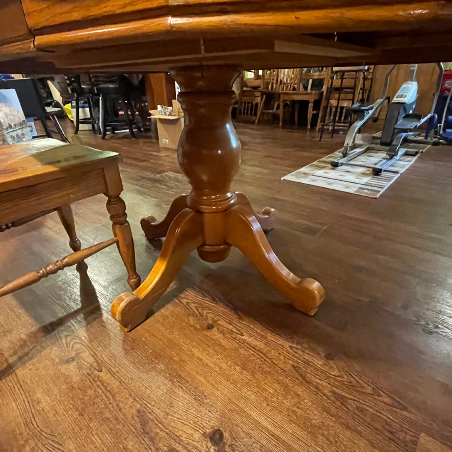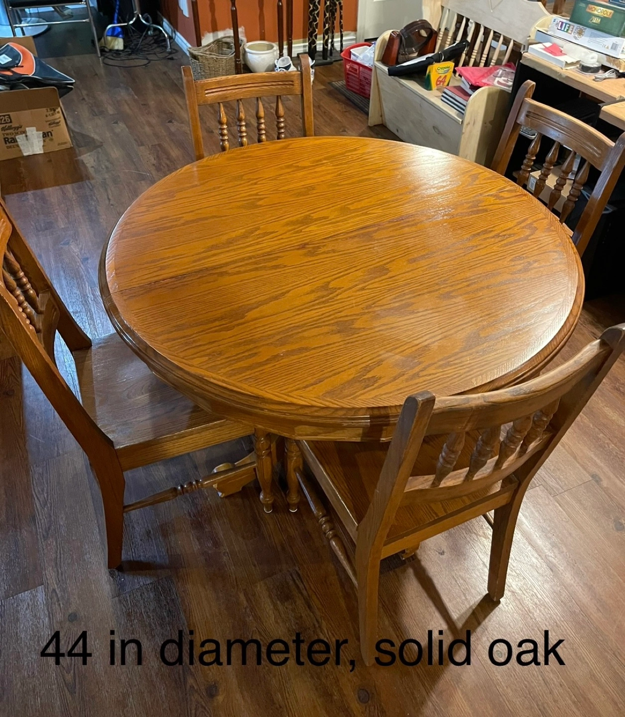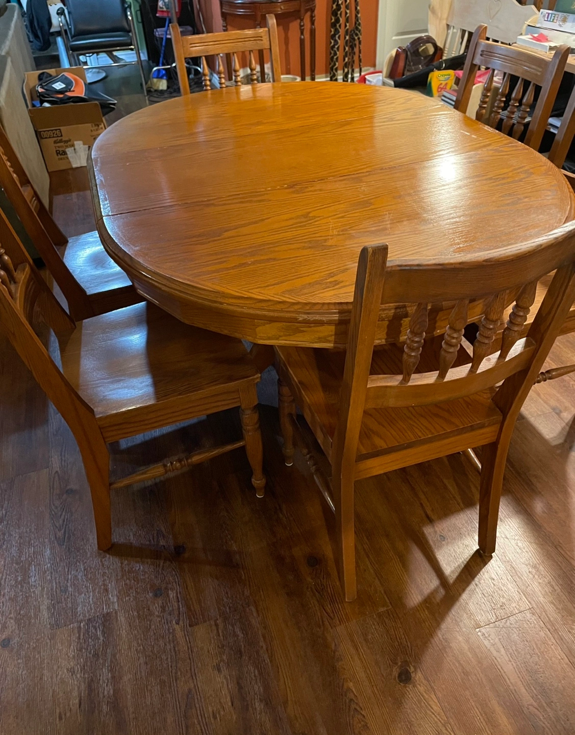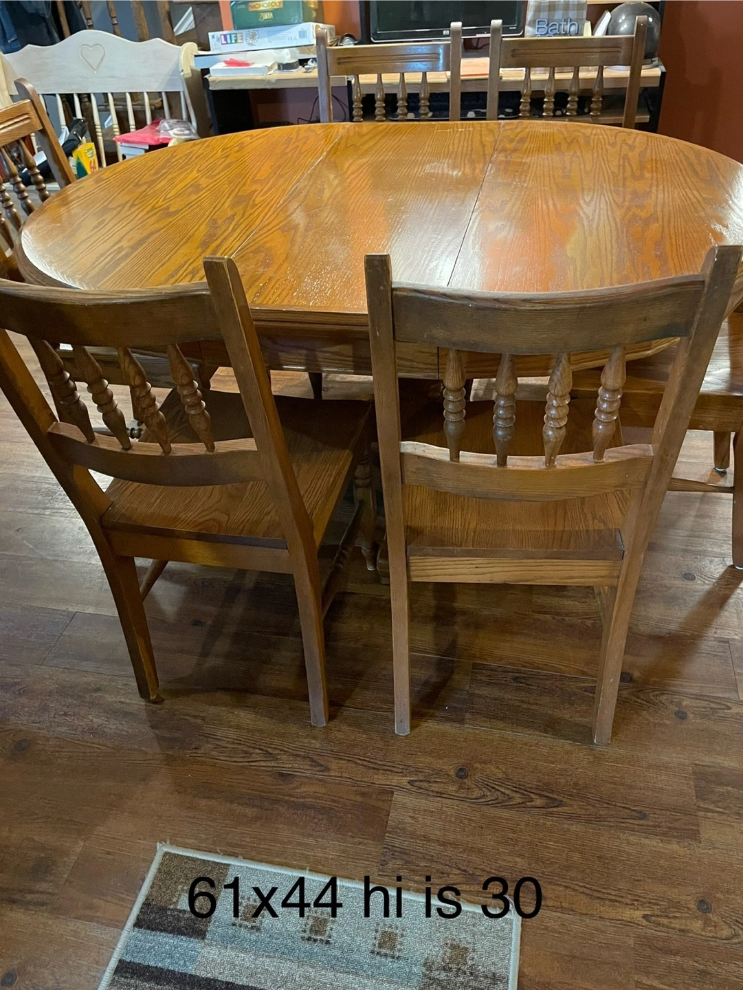 Extendable oval dining table, 61x44 inches. Table height is 30 inches. Features six matching chairs. Solid oak construction. Leaf allows for expansion.