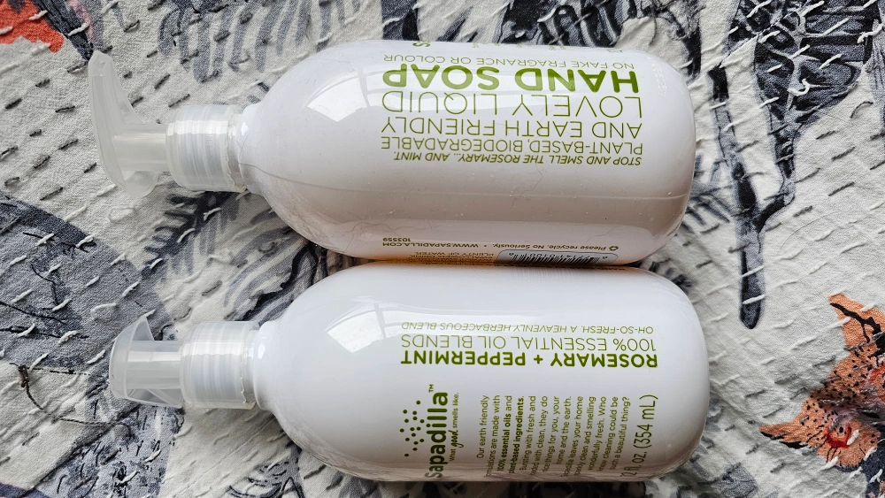 Two bottles of Sapadilla hand soap. Plant-based, biodegradable, lovely liquid hand soap. Rosemary and peppermint essential oil blends. Oh-so-fresh heavenly herbaceous blend.