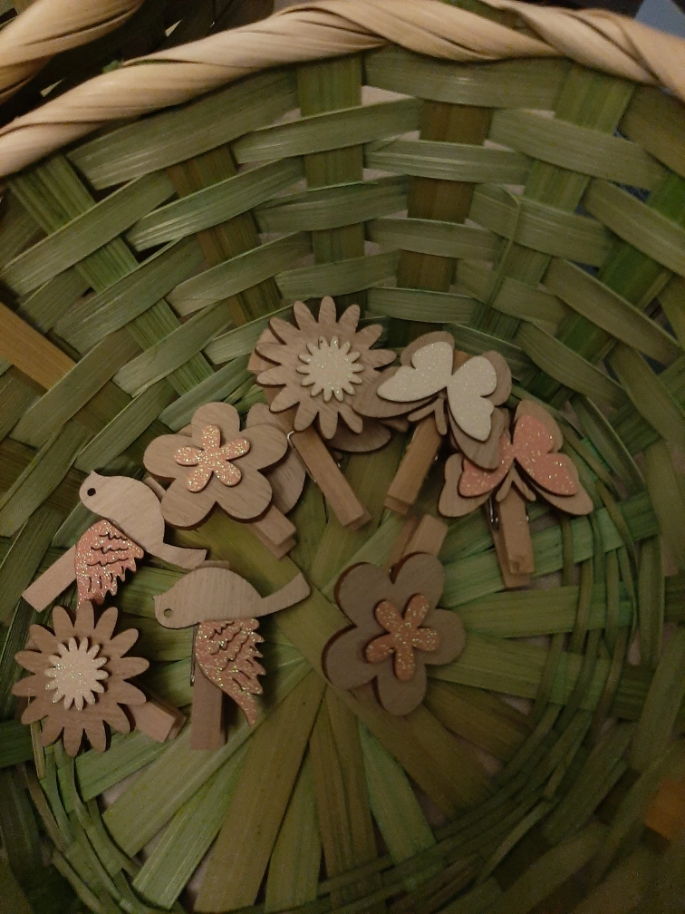 Charming set includes two-tiered woven basket, perfect for spring decor. Also features a collection of cute wooden clips with flower and bird designs. Pastel colours. Great for gift-giving or home use.