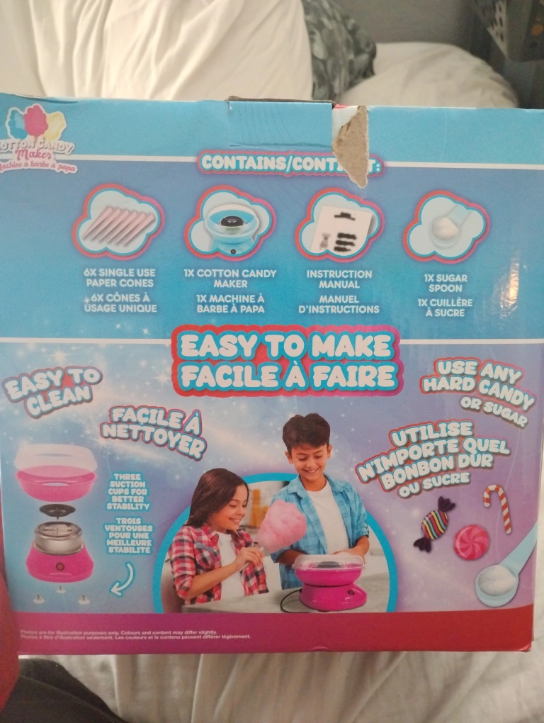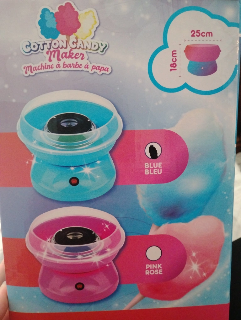 Never used. Brand new cotton candy maker. Includes machine, sugar spoon, cones, and instructions. Easy to clean and use. Perfect for families and any occasion.