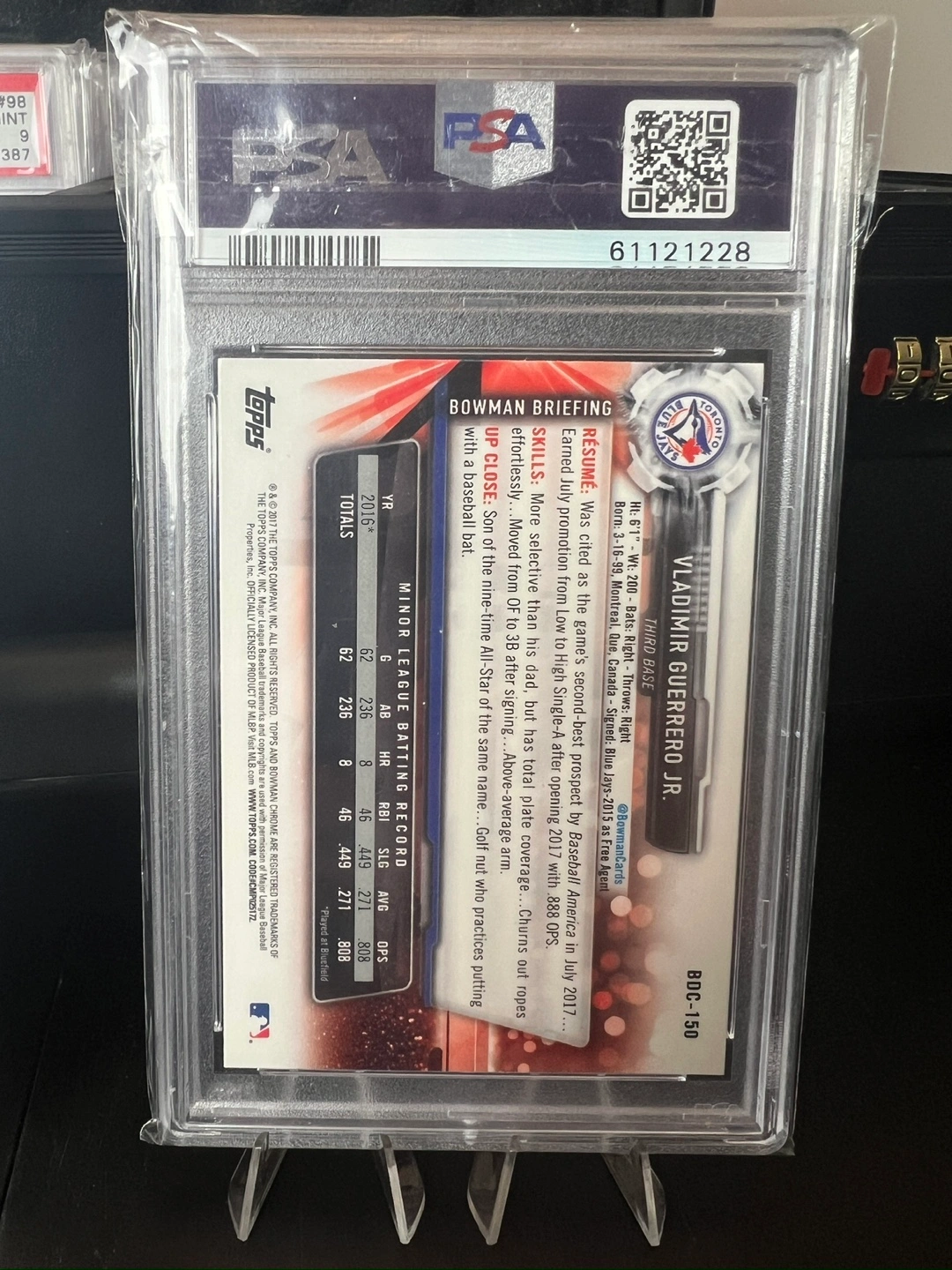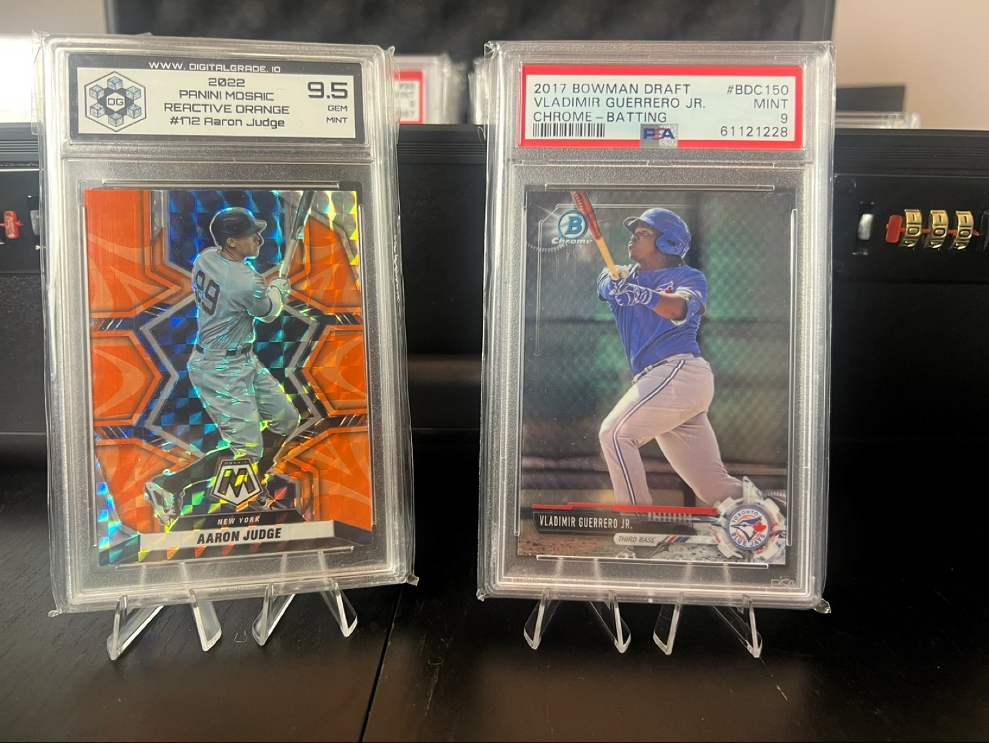 Two graded baseball cards. Vladimir Guerrero Jr. 2017 Bowman Draft Chrome, PSA 9. Aaron Judge 2022 Panini Mosaic Reactive Orange, Digital Grade 9.5.