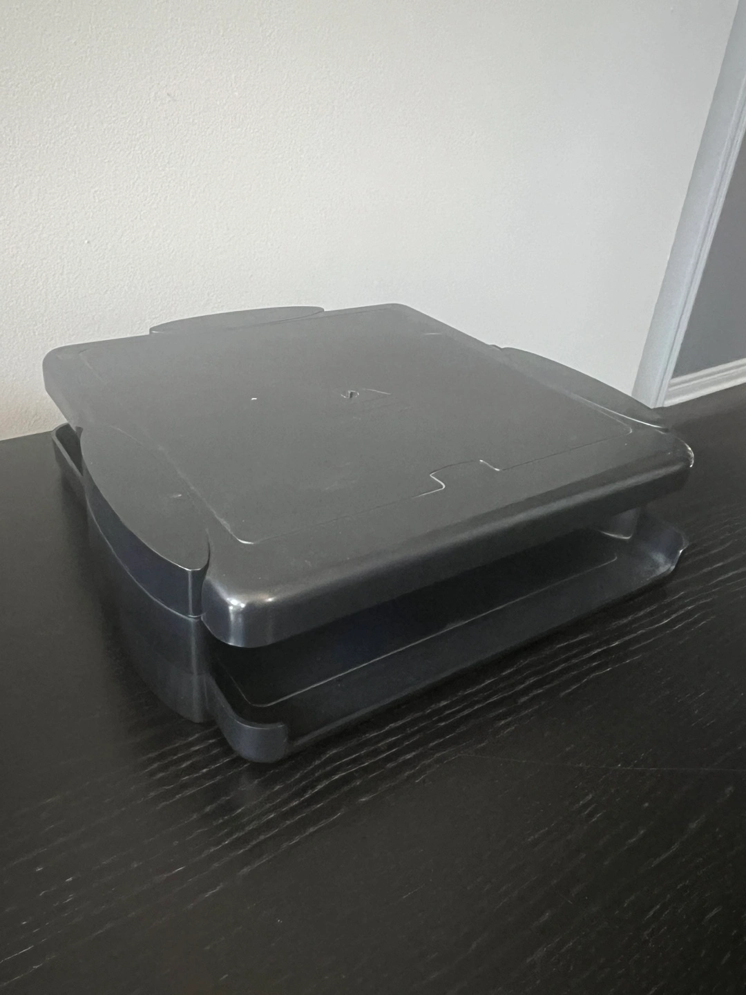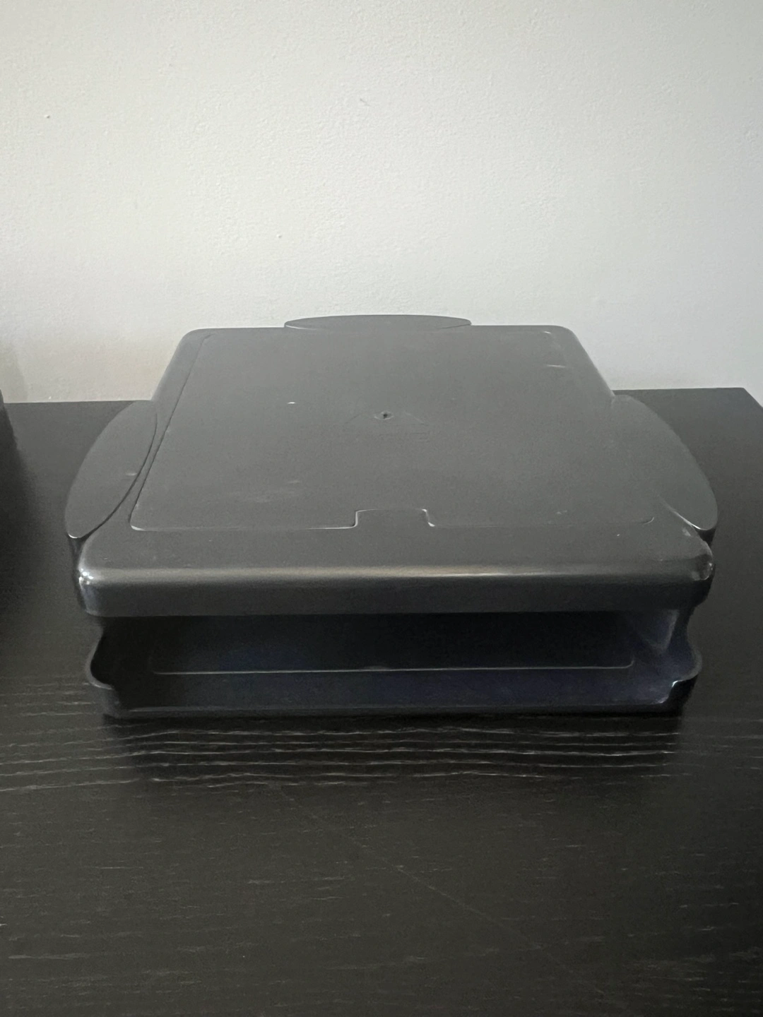 Black riser /stand for monitor or laptop. Allows for storage of papers, etc.