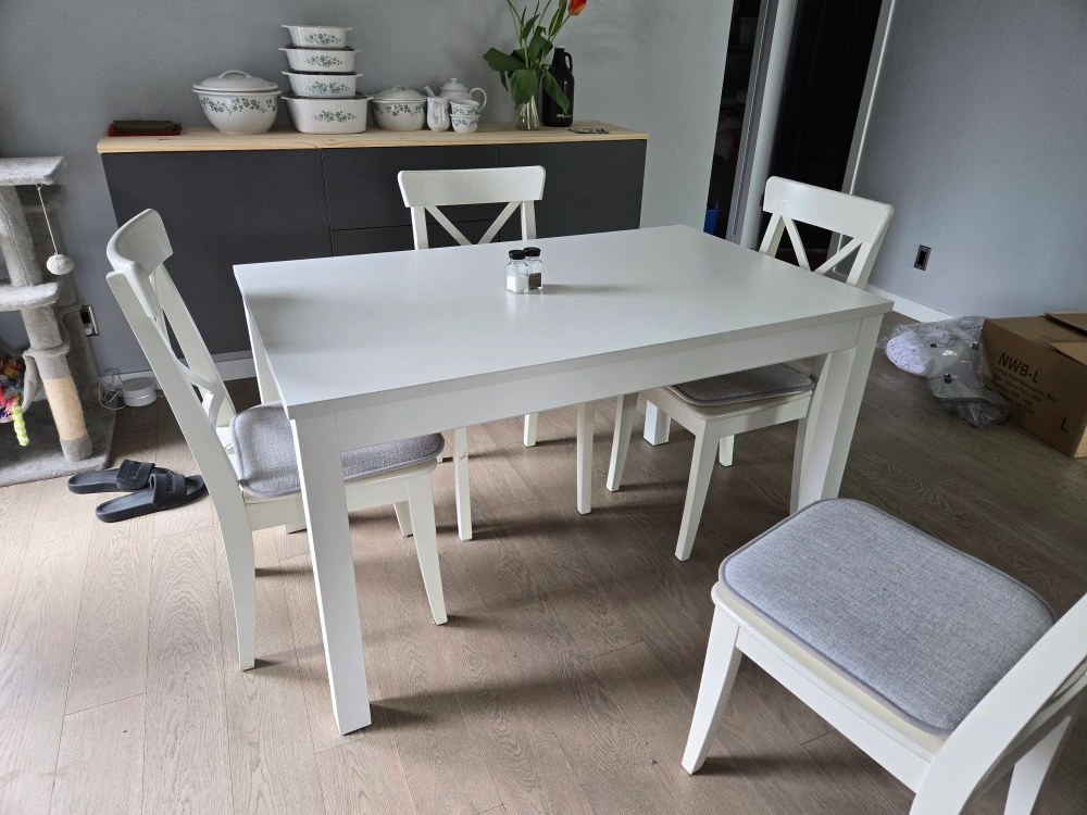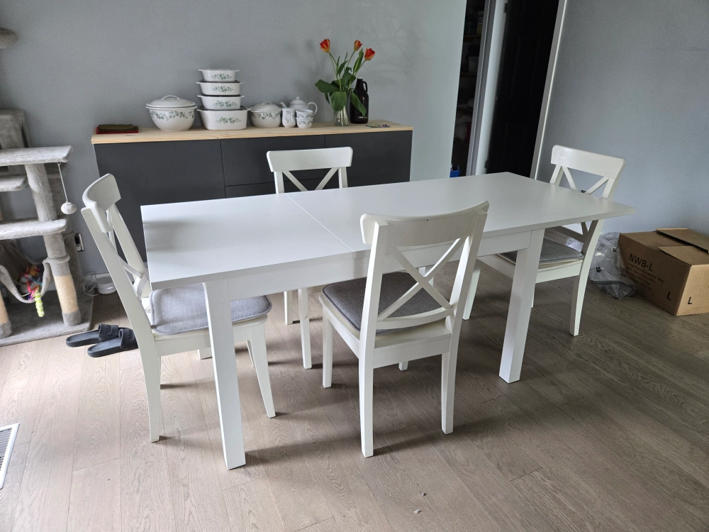 White dining table. Table extends for extra space. Simple, modern design. chairs not included