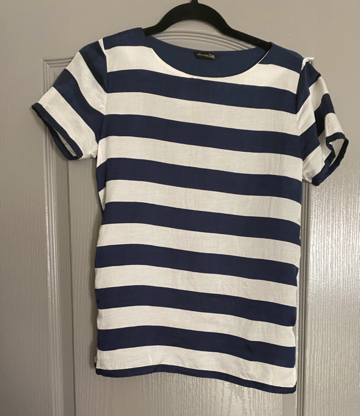Women's short sleeve top. 70% cotton and 30% silk. Navy and white horizontal stripes. Almost like new. Relaxed fit. Slightly longer length.
