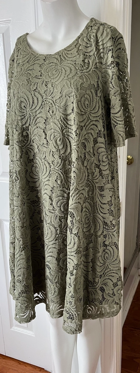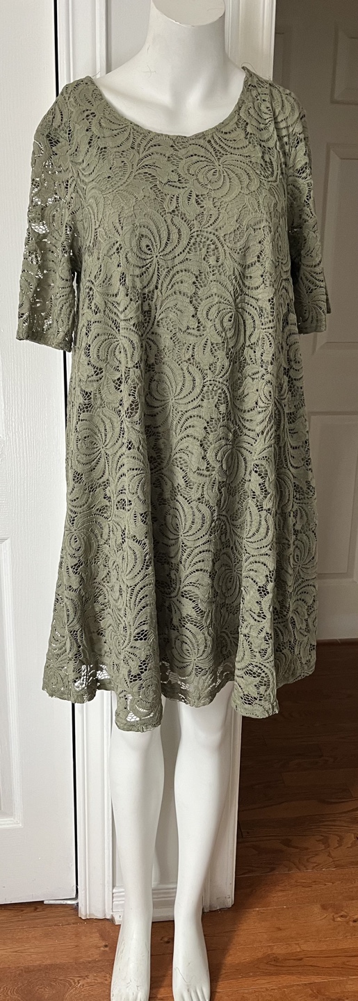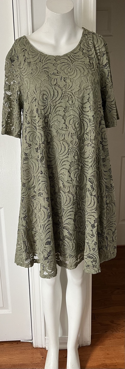 Beautiful olive green lace dress. Size 12. Short sleeves. A-line silhouette. Made in China.