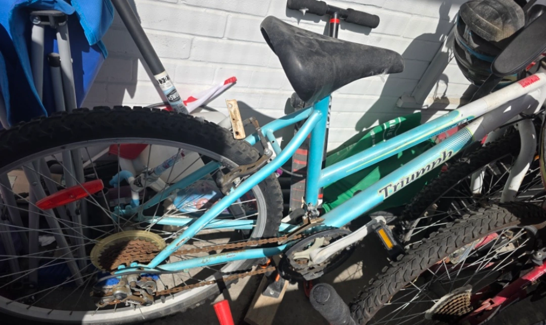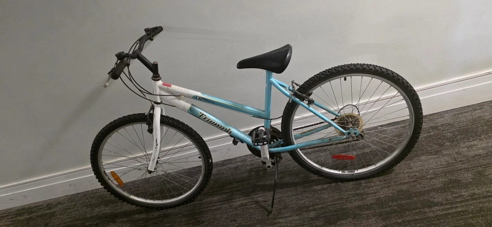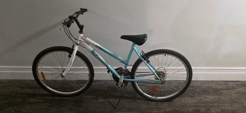 Used Triumph mountain bike. Teal coloured frame. Shows signs of wear. Needs some TLC. Great for casual riding.Girls' bicycle. Light blue and white. 24" wheels. 15 gears
