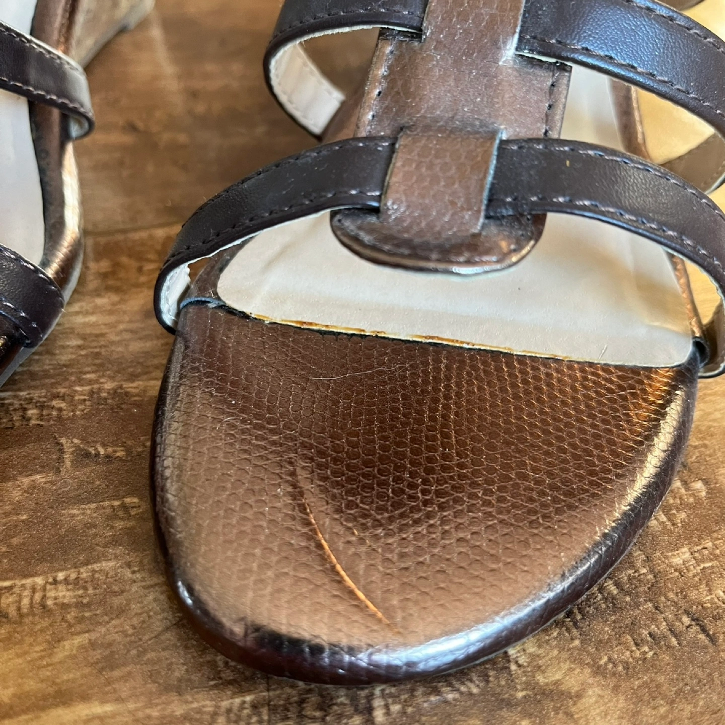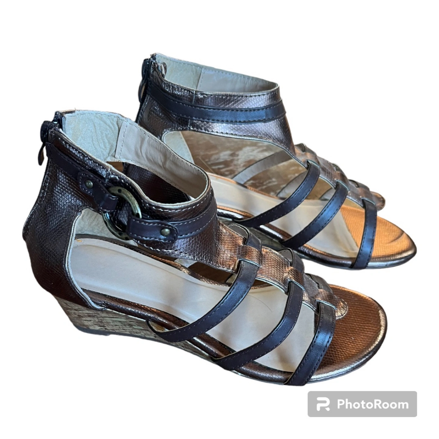 Women's brown and copper metallic wedge sandals. Features multiple straps, ankle buckle closure, and zipper on the back. Faux cork wedge heel. Man-made materials.