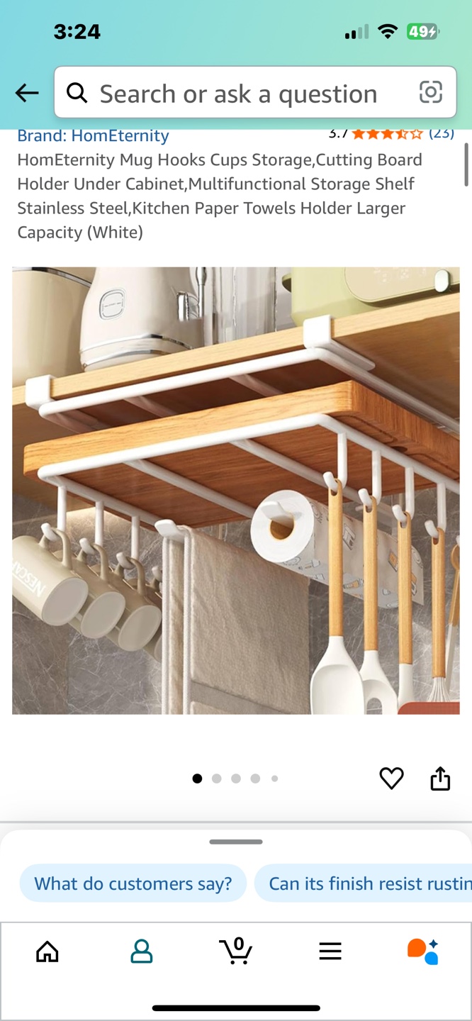 White multifunctional shelf. Includes mug hooks, cutting board, and paper towel holder. Stainless steel.