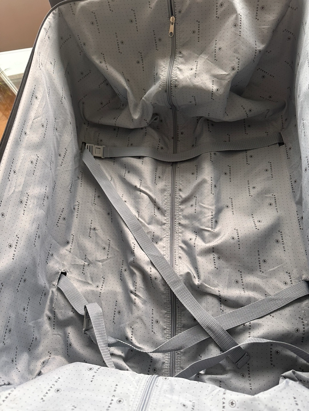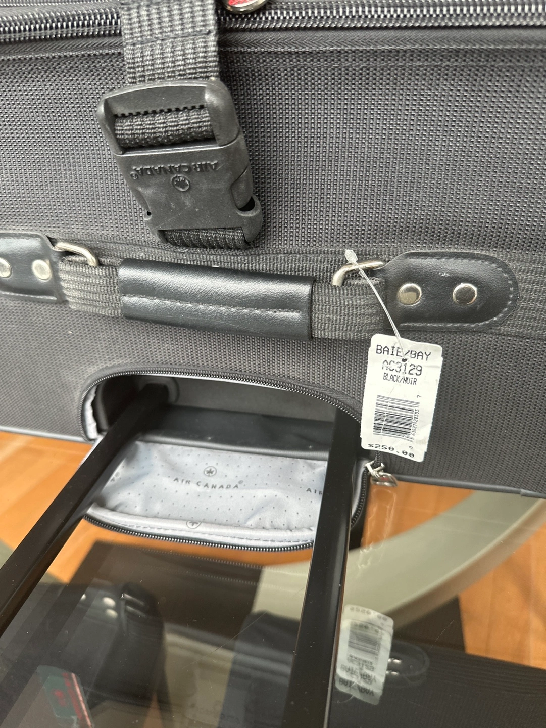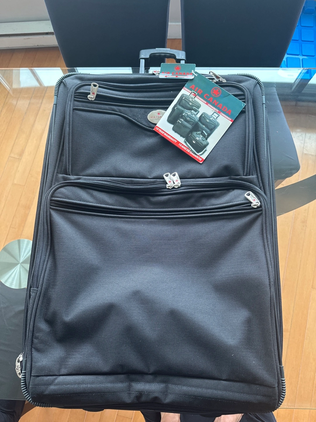 Brand New. Original price $250 Large black rolling suitcase. Features multiple compartments and interior straps. Excellent for travel. Measures approximately 30 inches.