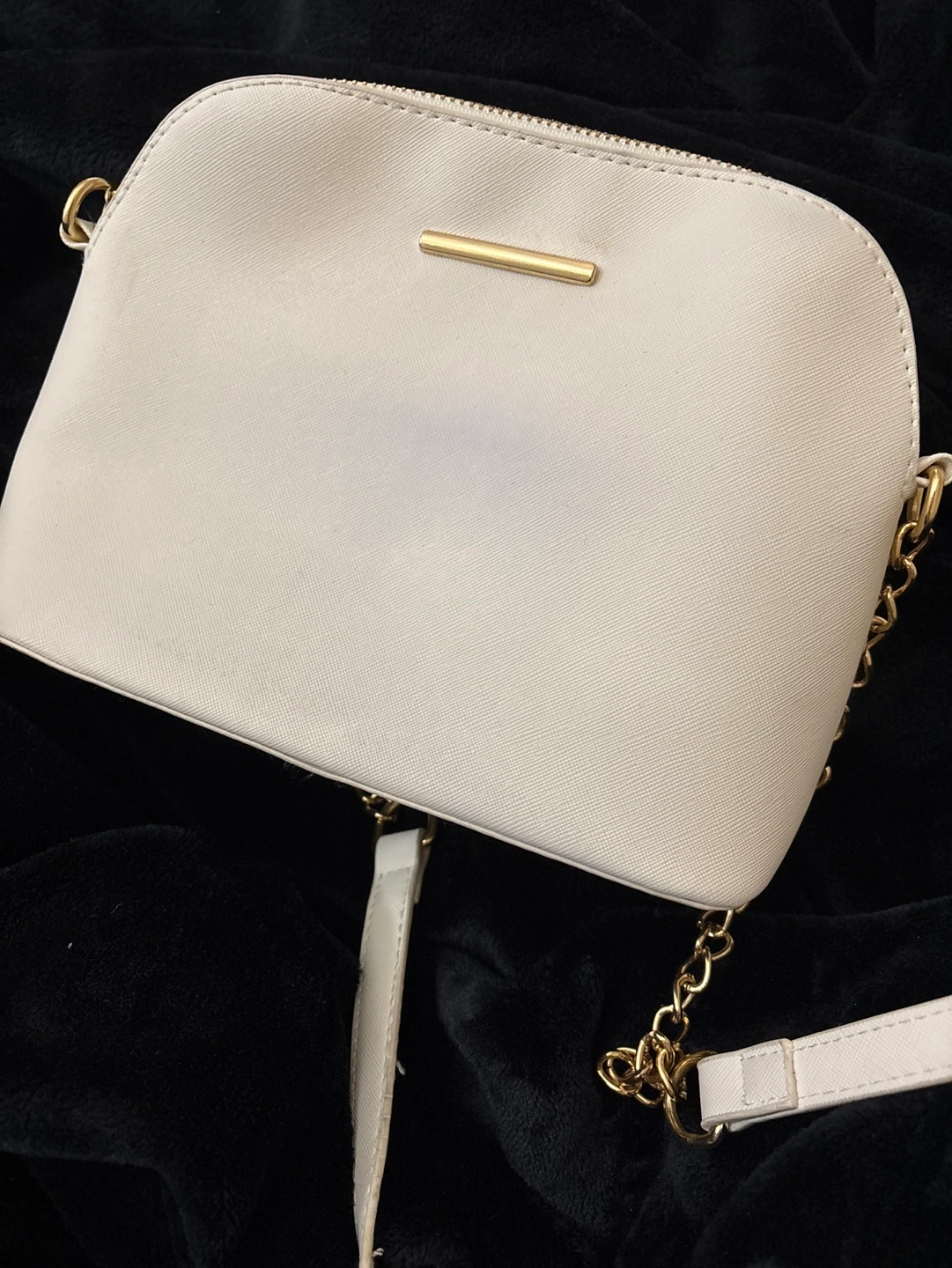 Small off-white crossbody bag. Features a gold chain strap and gold-toned hardware. Zipper closure. Slight wear.