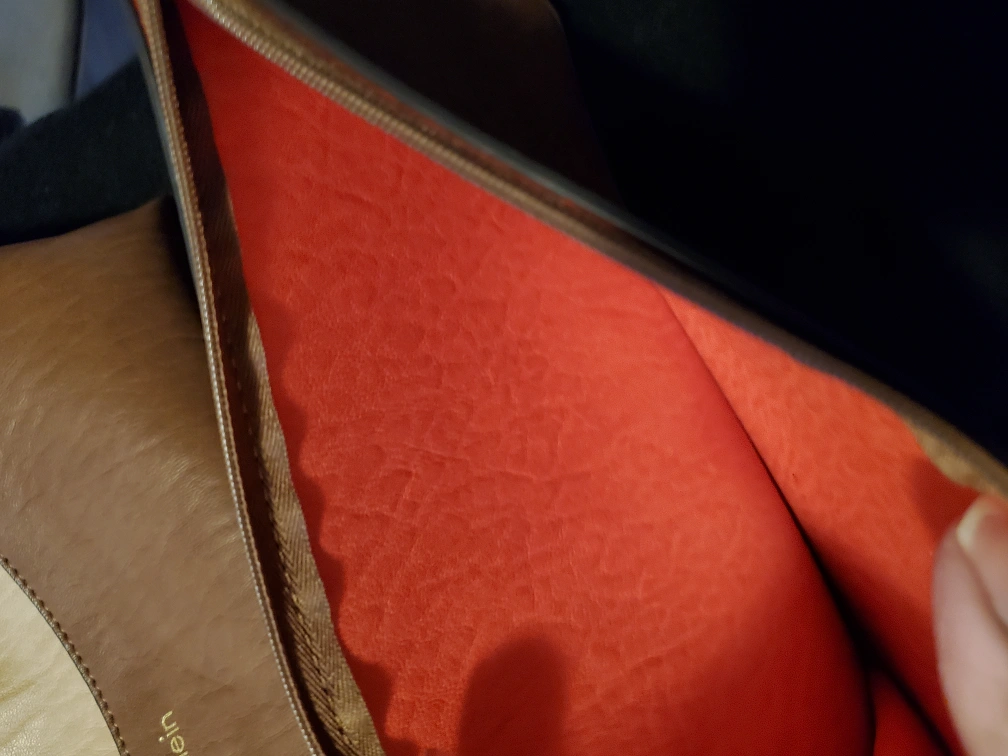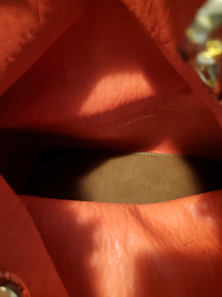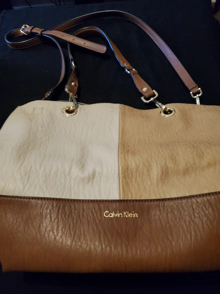Gorgeous Calvin Klein tote bag. Features three colours: brown, beige, and off-white with orange interior. Matching wristlet included. Adjustable shoulder strap. Great for everyday use.