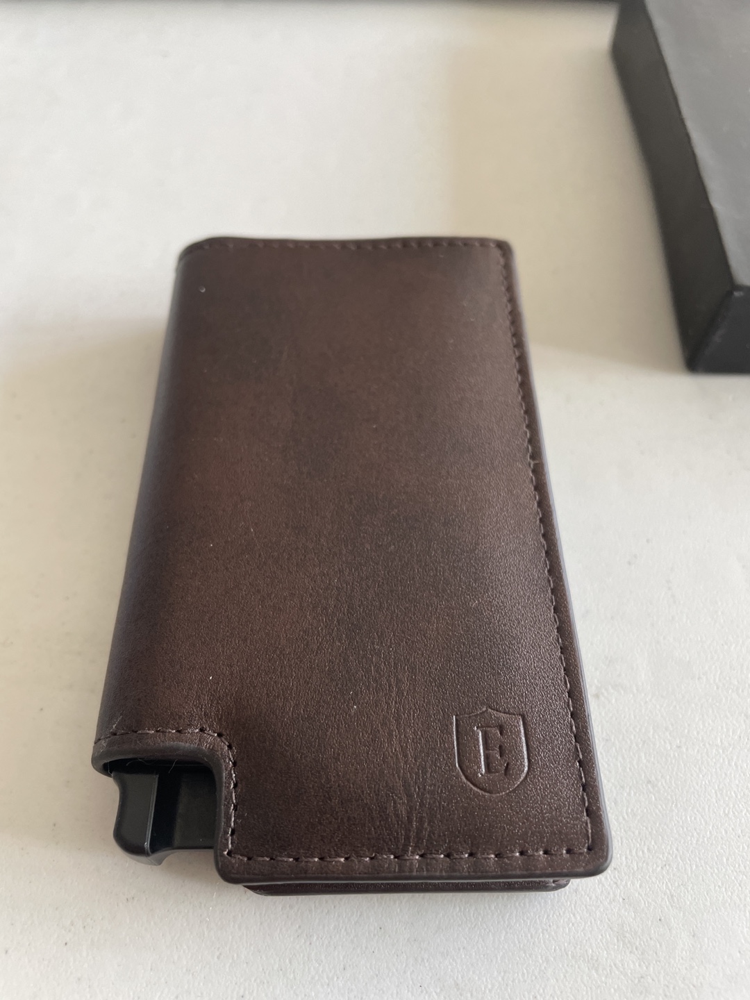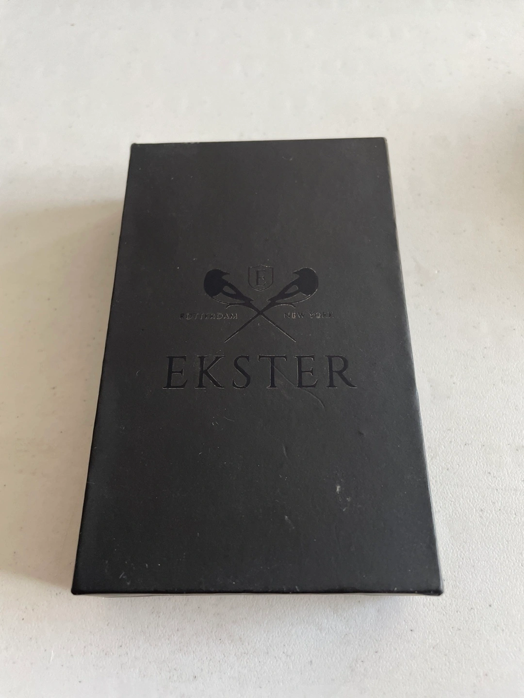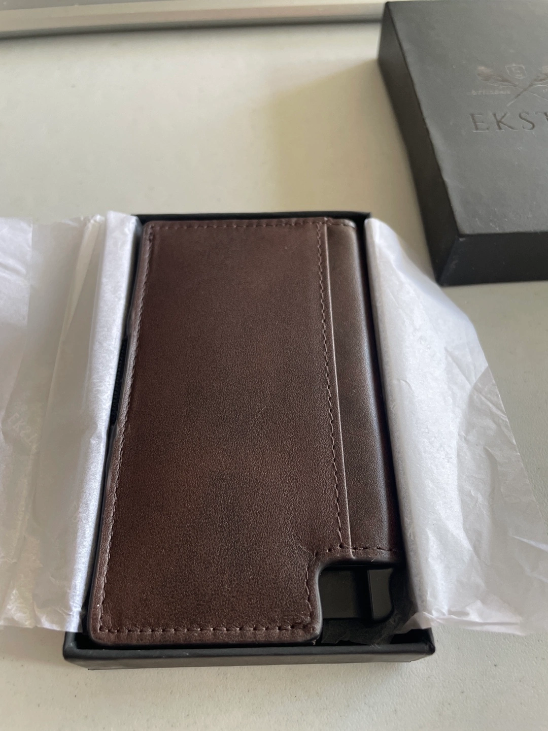 Brown leather Ekster Parliament wallet. Slim design, includes elastic band. New in box.