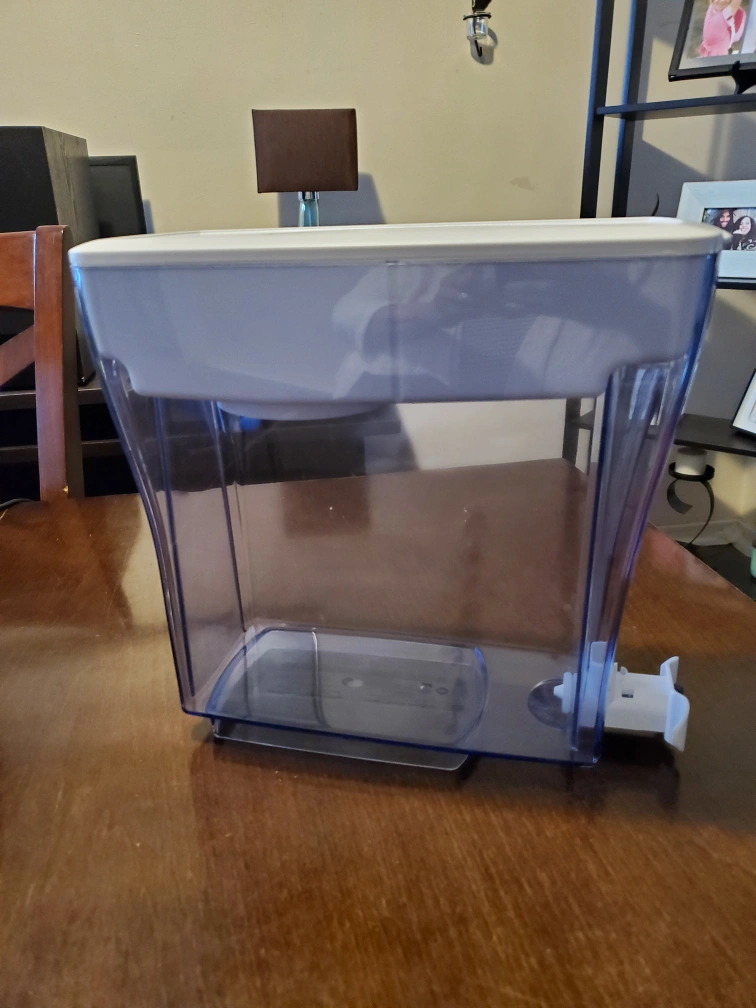 Large capacity water dispenser. Clear plastic with a white lid. Features a dispensing tap. Used, but in good condition.