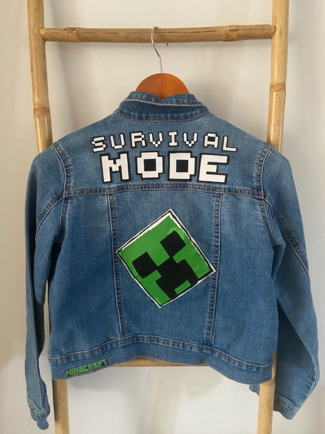 257Kids' size denim jacket. Features one-of-a-kind Minecraft Creeper design. Old Navy size 14 Broadview and Danforth