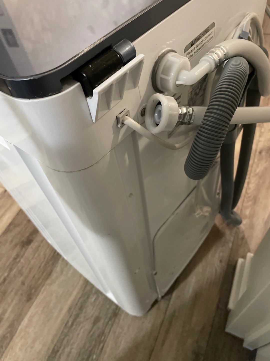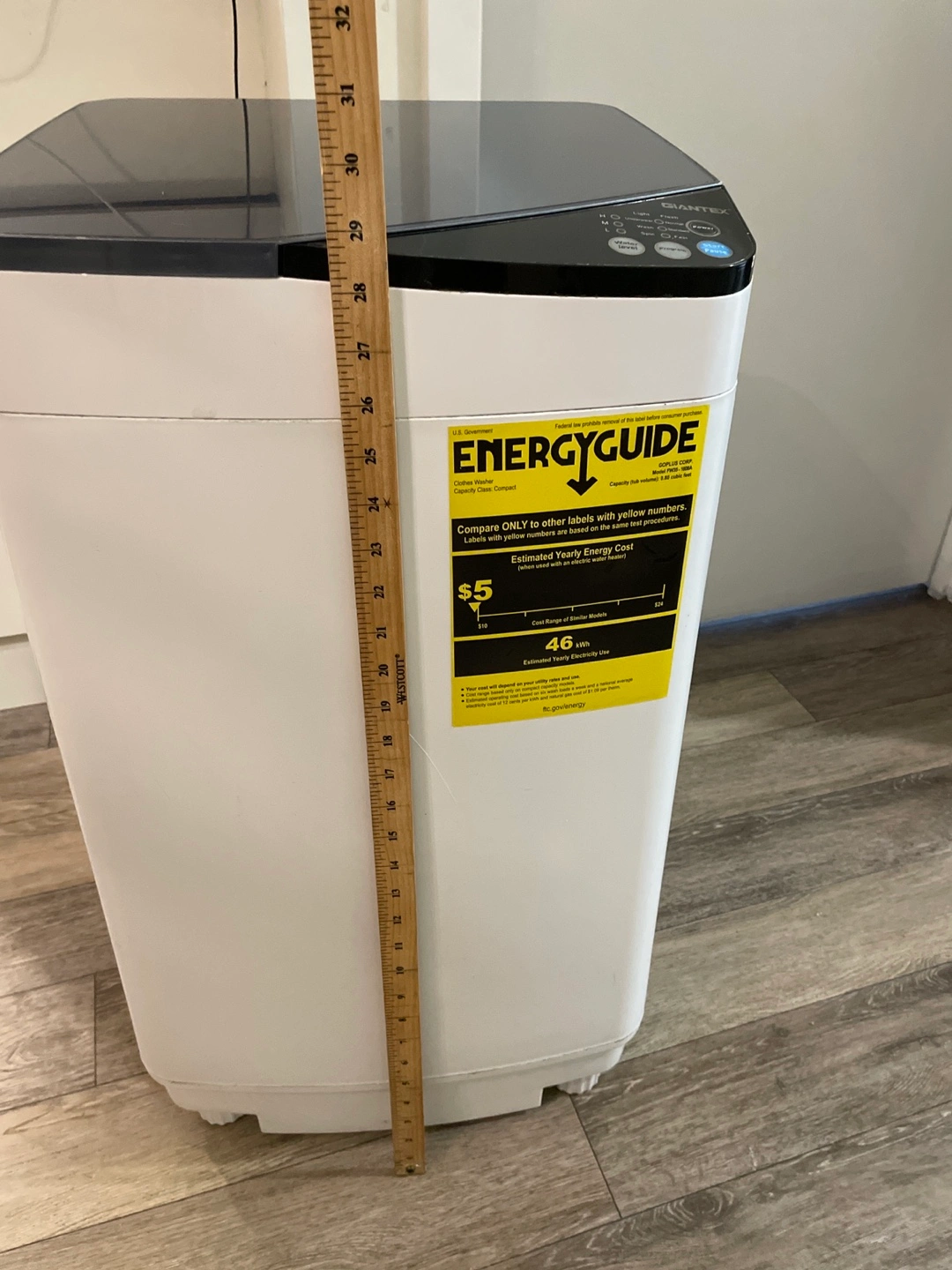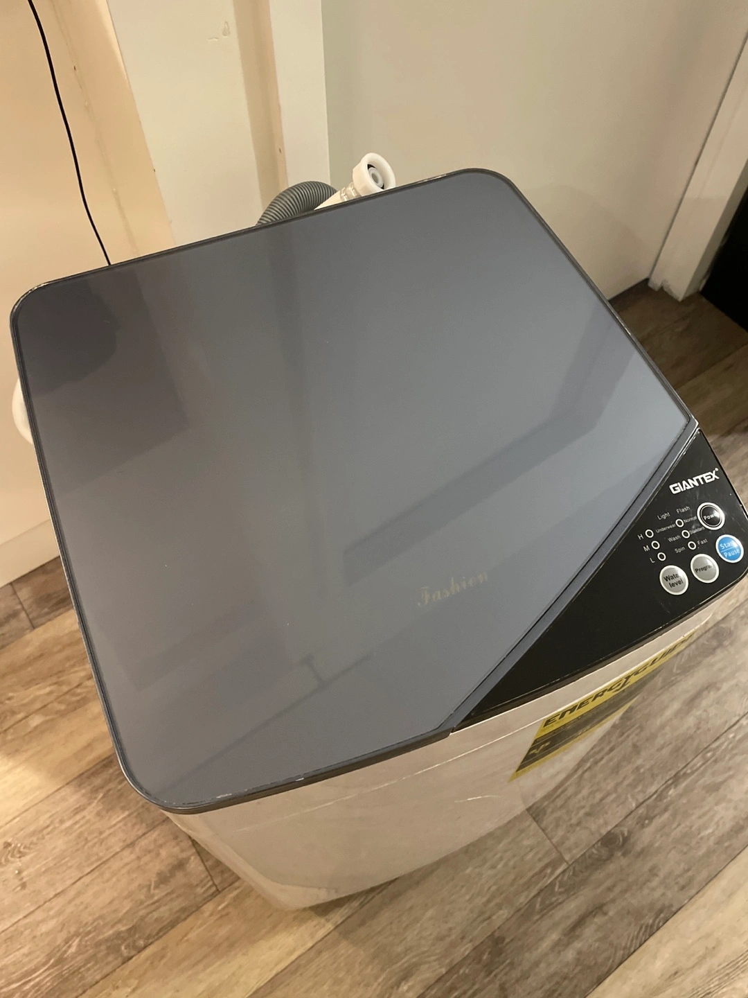 Giantex brand portable compact washing machine. White with dark grey top. Features multiple wash cycles. Includes drain hose. Good for small spaces. Washes perfectly but doesn't spin very well, maybe used as parts.