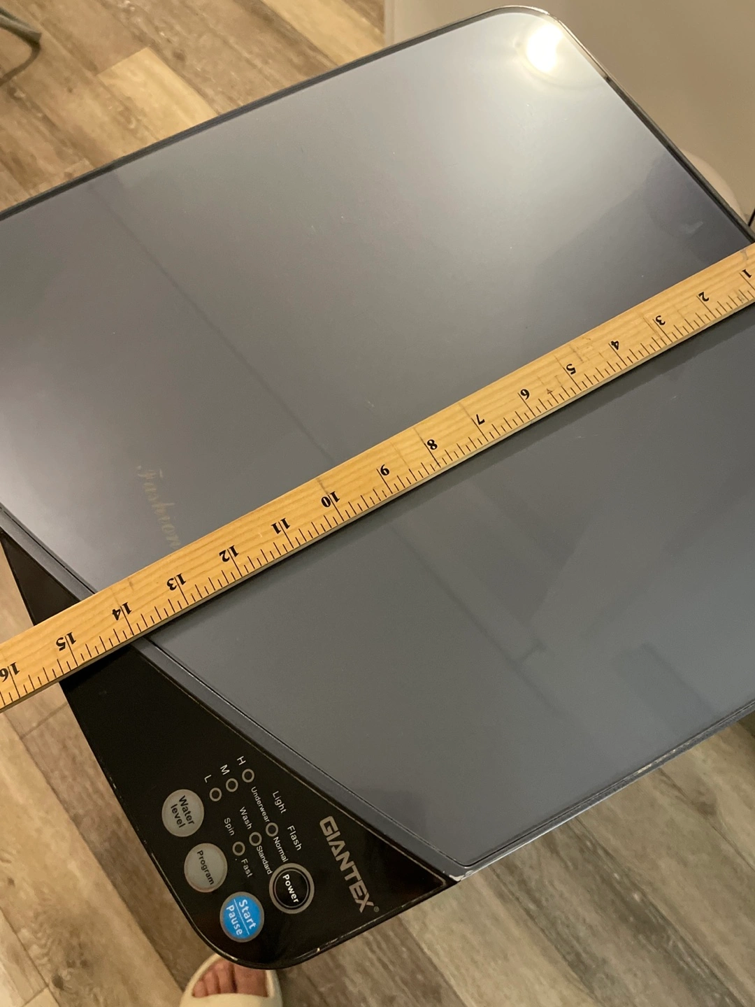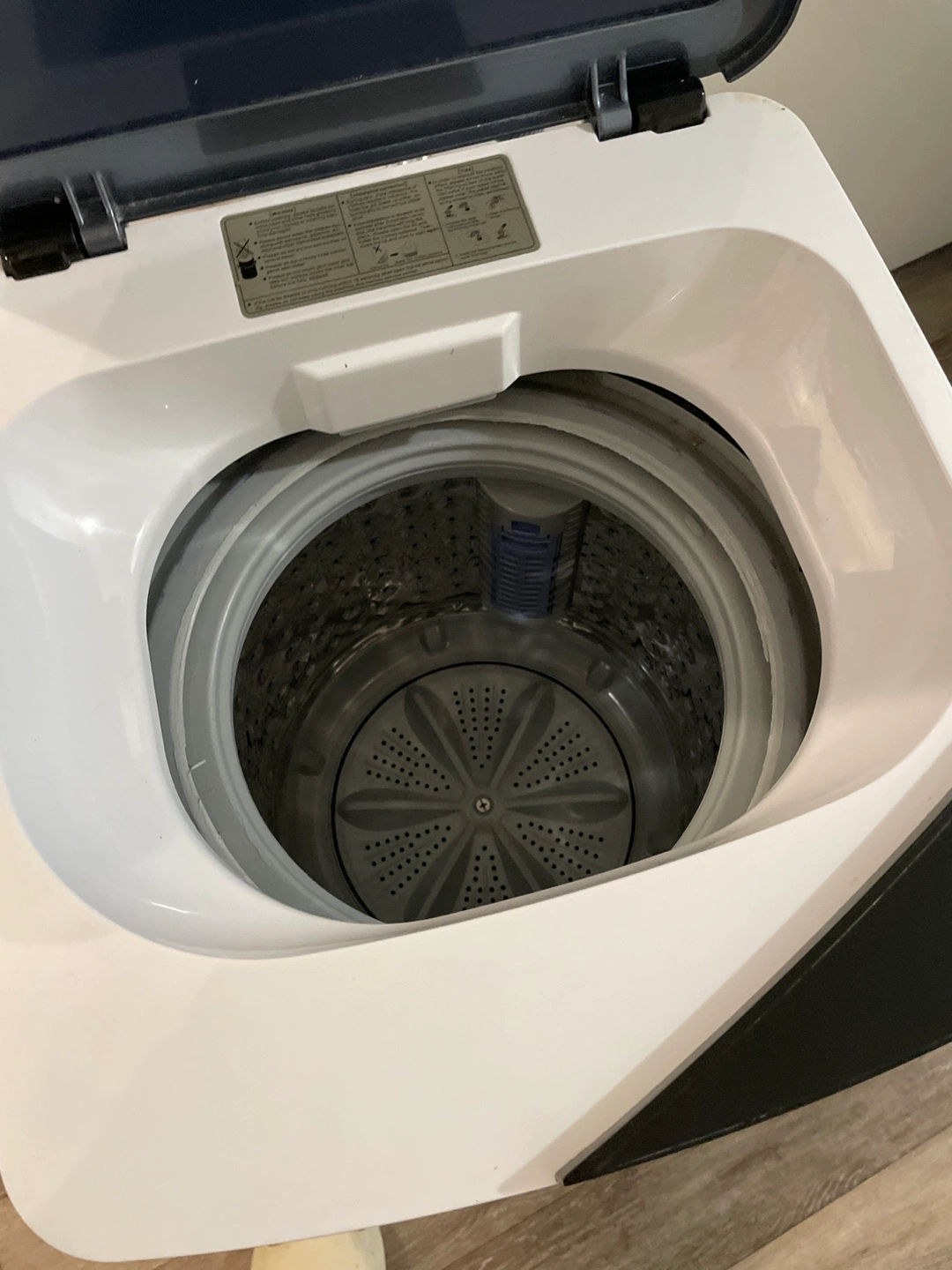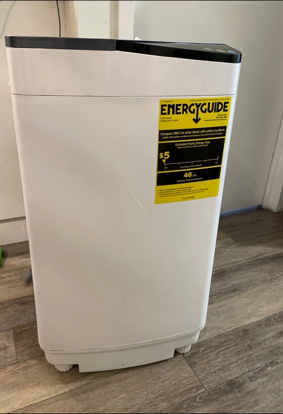 Giantex brand portable compact washing machine. White with dark grey top. Features multiple wash cycles. Includes drain hose. Good for small spaces. Washes perfectly but doesn't spin very well, maybe used as parts.