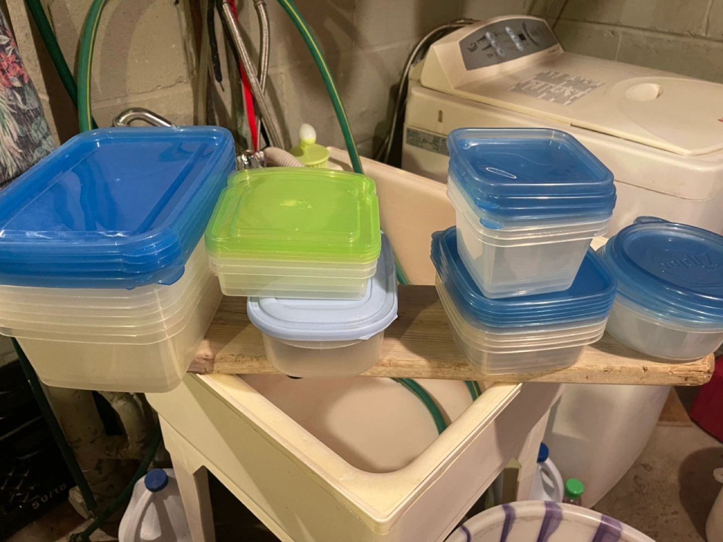 Assortment of square and rectangular plastic containers. Various sizes and colours. Includes lids. Good for leftovers or meal prep. Sold as a bundle.