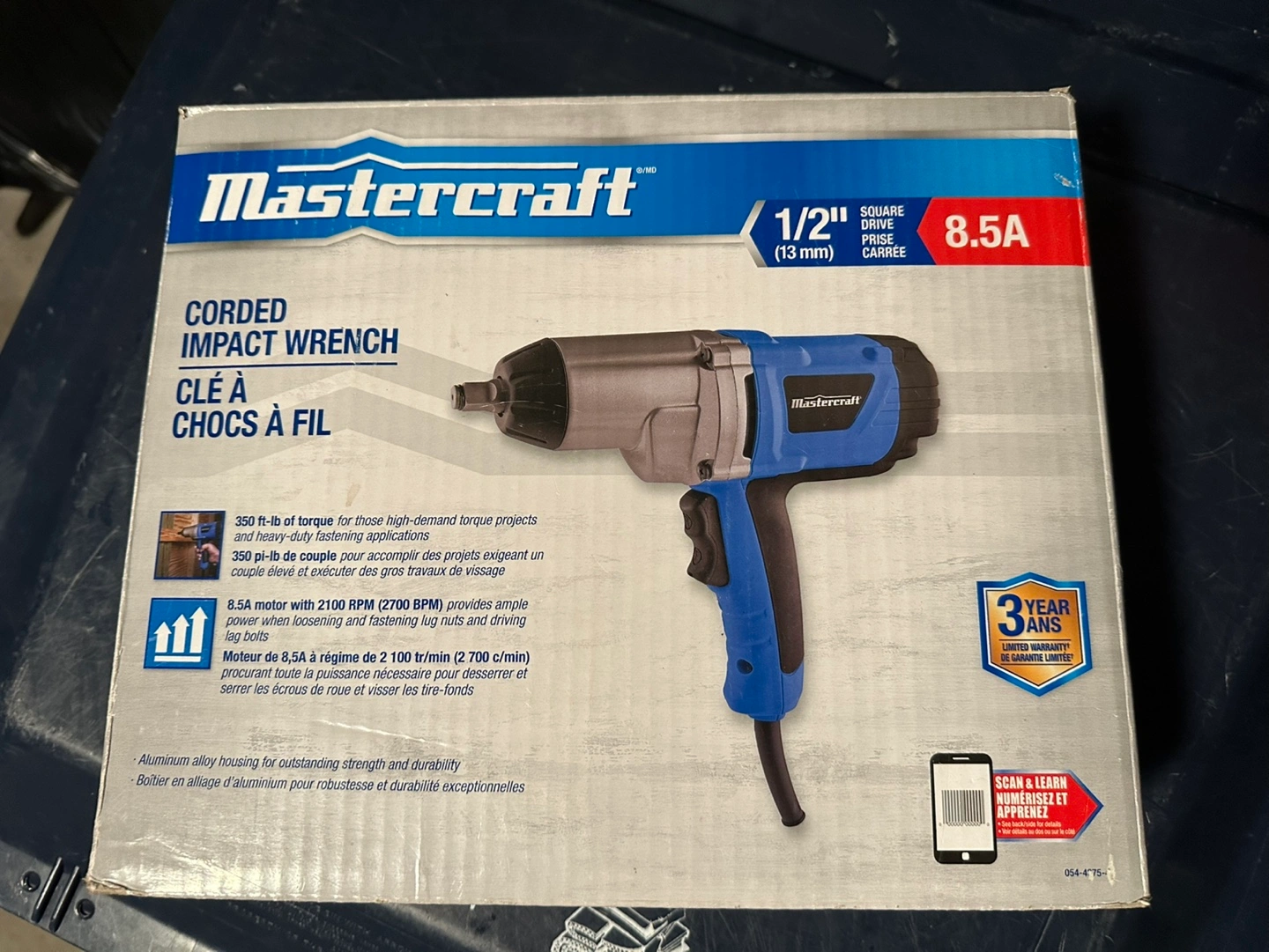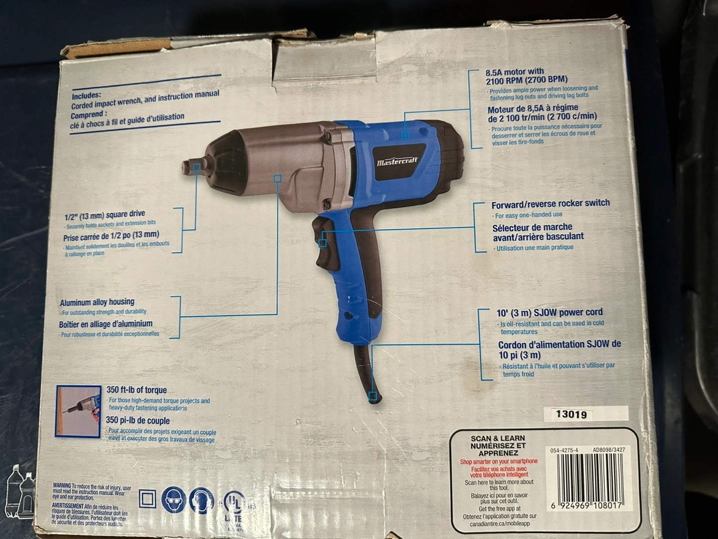 Powerful 8.5A motor. 2100 RPM and 2700 IPM. Aluminum alloy housing. 350 ft-lb of torque. Includes impact wrench and instruction manual. Forward/reverse switch.